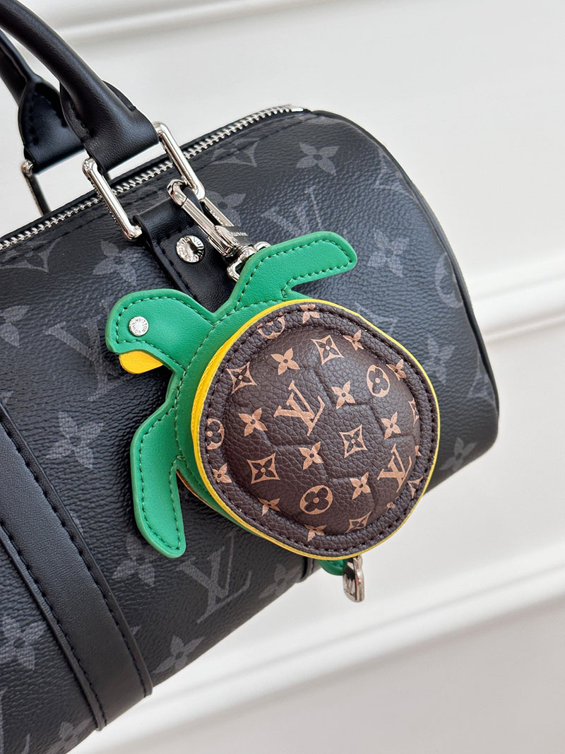機能的で遊び心溢れるアクセサリー「キーホルダー・LV タートル」。モノグラム・キャンバス、カラフルなレザー、そしてシルバーカラーのスナップフックを組み合わせたフレンドリーなカメは、装飾的な特徴を持つお守りとしてバッグに取付けることが可能。甲羅部分は外出中にイヤホンを収納するのにぴったりです。