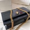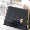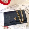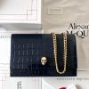 シャイニーなクロコ風型押しブラックカーフレザーで作られたスモール スカルバッグです。ゴールド仕上げのスカル(どくろ)が付いています。