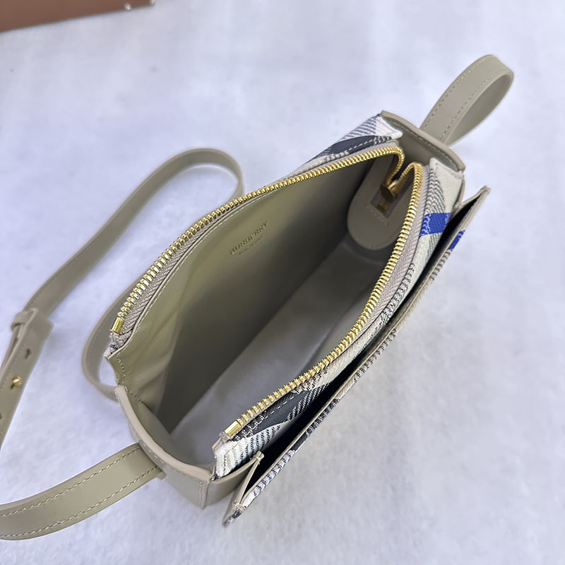 撥水性のあるコットンブレンドを使用したイタリア製ジップバッグ。ジャカード織のバーバリーチェックをフィーチャーしました。Bカット金具のシェイプを反映したボクシーなデザイン。ジオメトリックなトップステッチを配し、スムースレザーのライニングを施しました。長さを調節できるカーフレザーのストラップでクロスボディバッグからショルダーバッグに切り替えても。