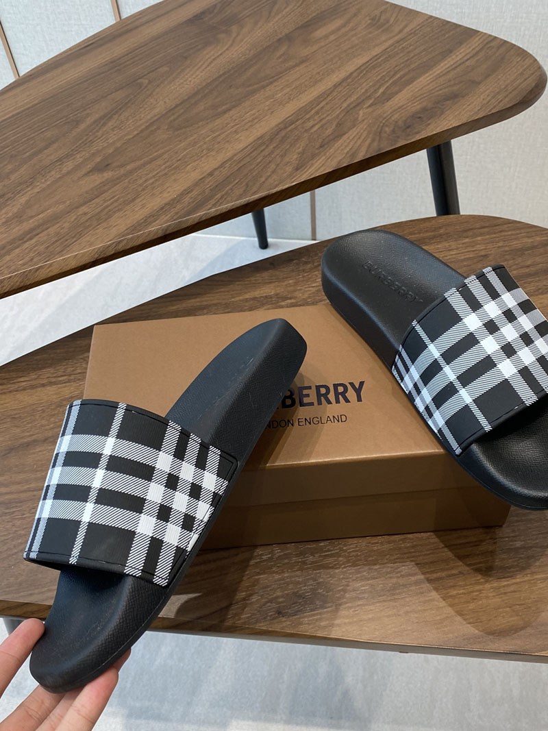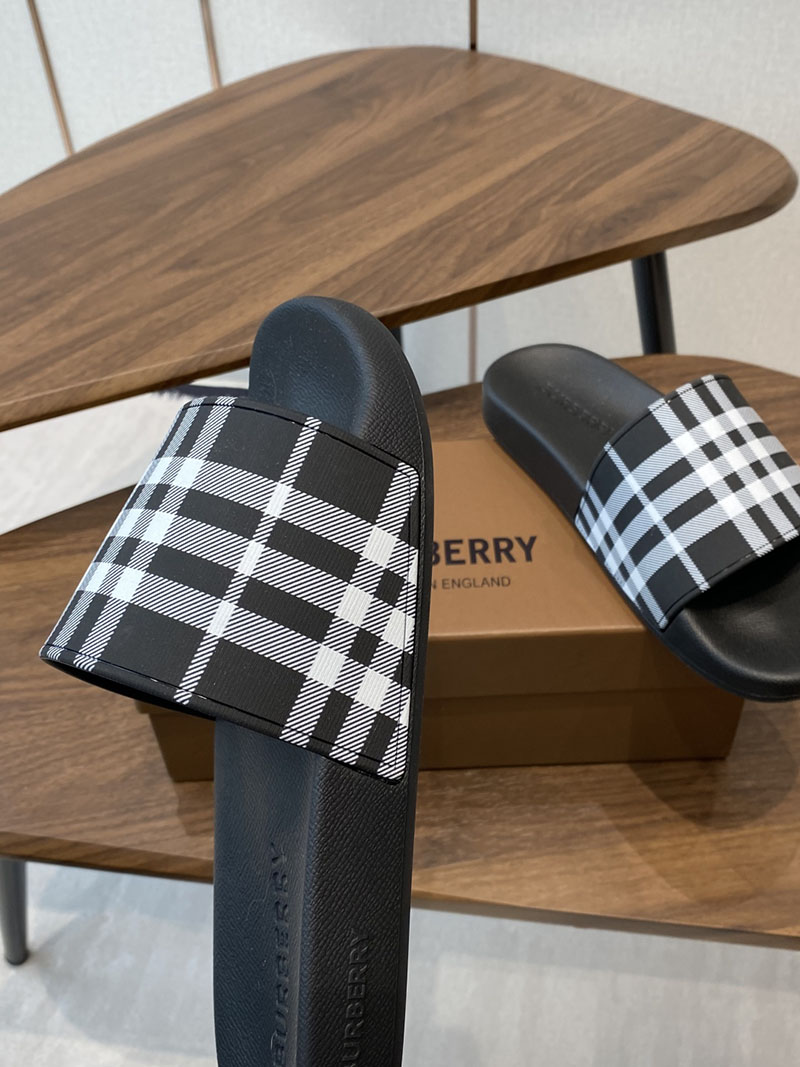 バーバリーチェックをプリントしたイタリア製スライドサンダル。チャンキーなソールにバーバリーロゴをデボスしました。