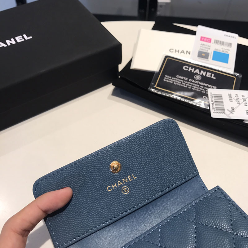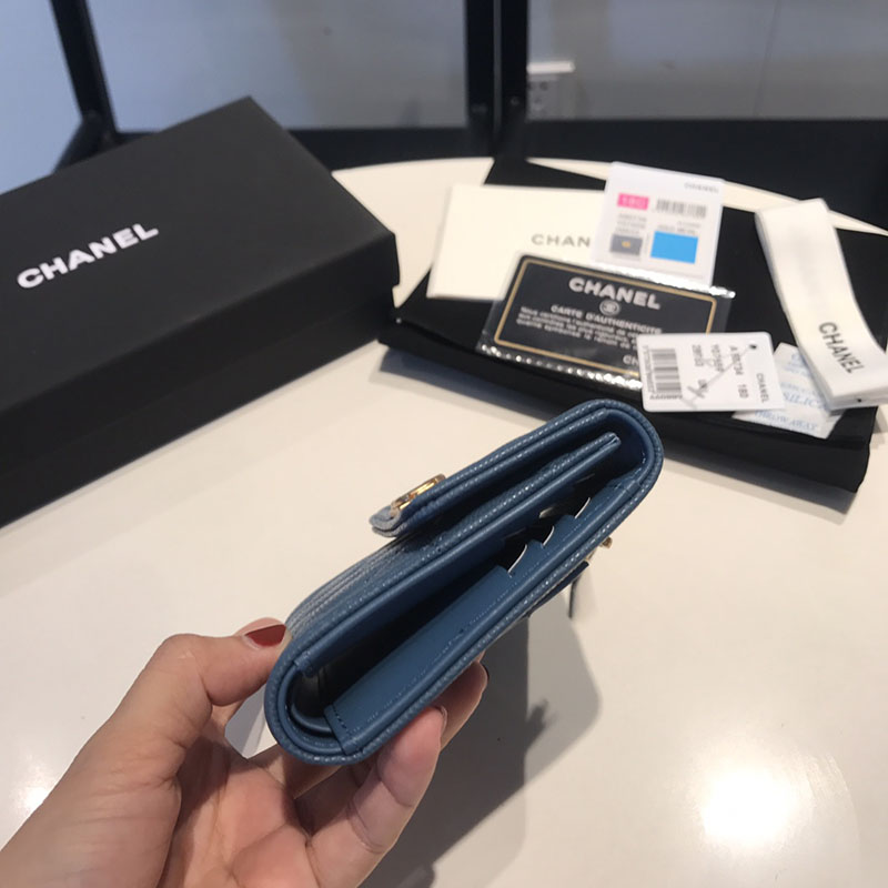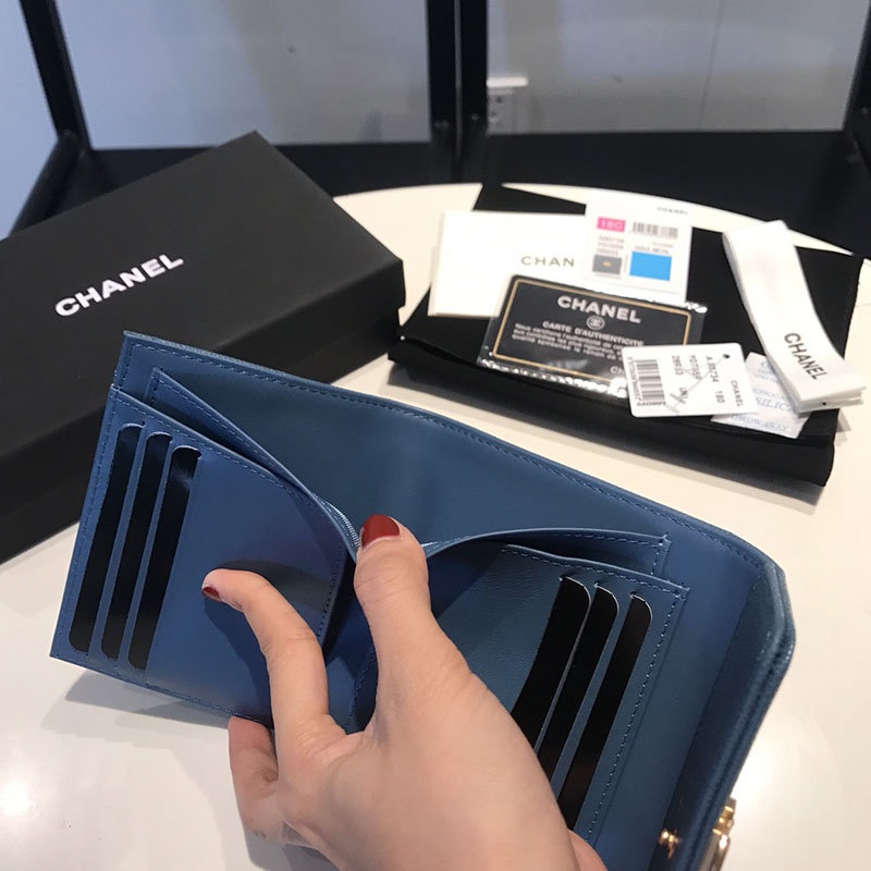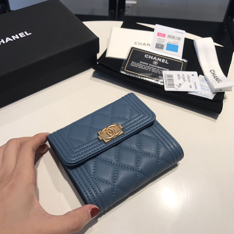シャネルで人気の財布 CHANEL 三つ折り財布 BOY CHANELスモールウォレット A80734 ブルー 2520329 シャネル 財布 ミニ 新作