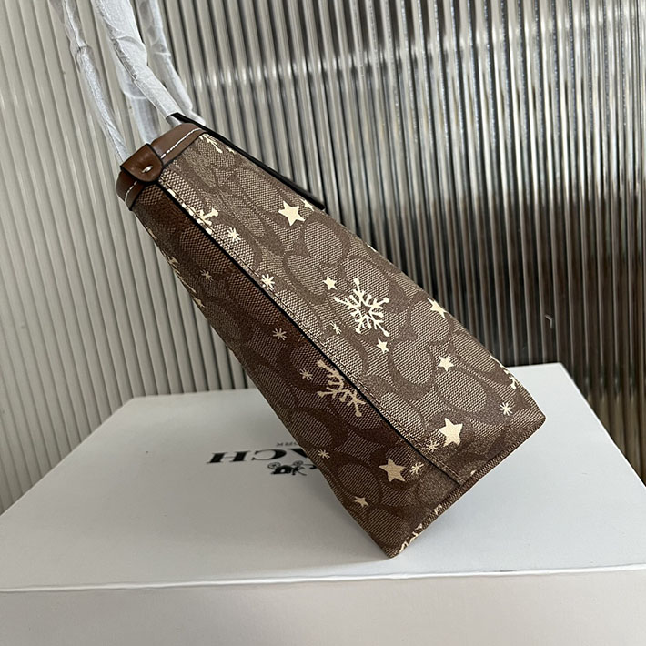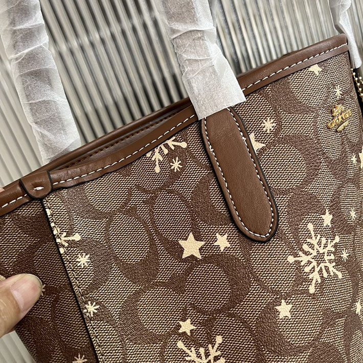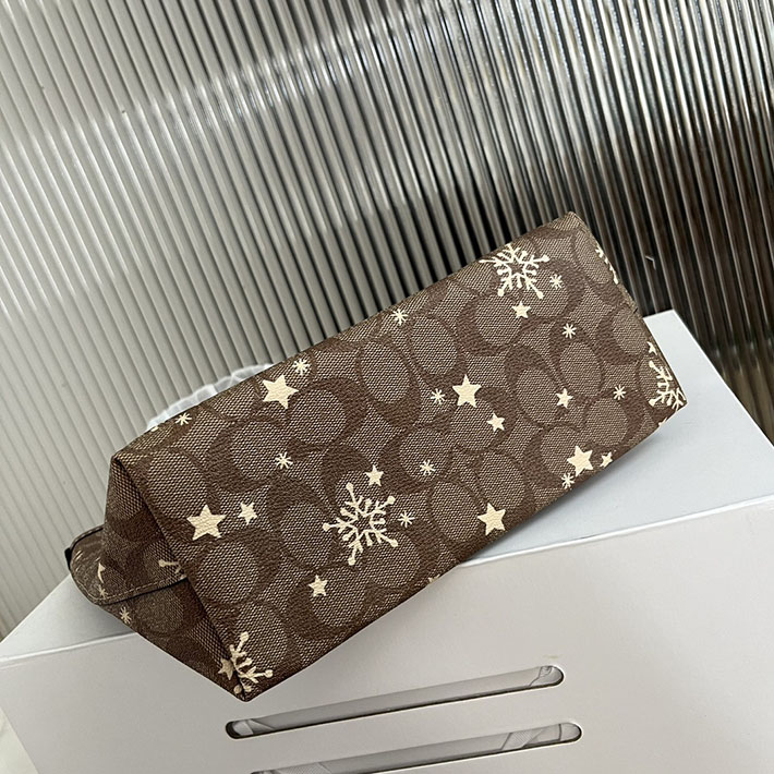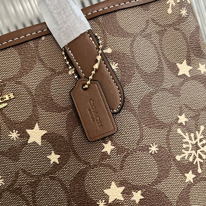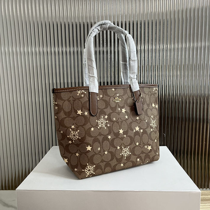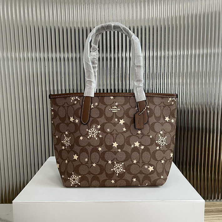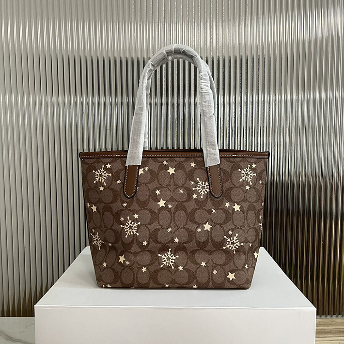 コーチ ミニ シティ トート・シグネチャー キャンバス・スター アンド スノーフレーク プリント CN682 IMWD9 カーキサドル/ゴールドマルチ ゴールド金具 コーチ トートバッグ 人気