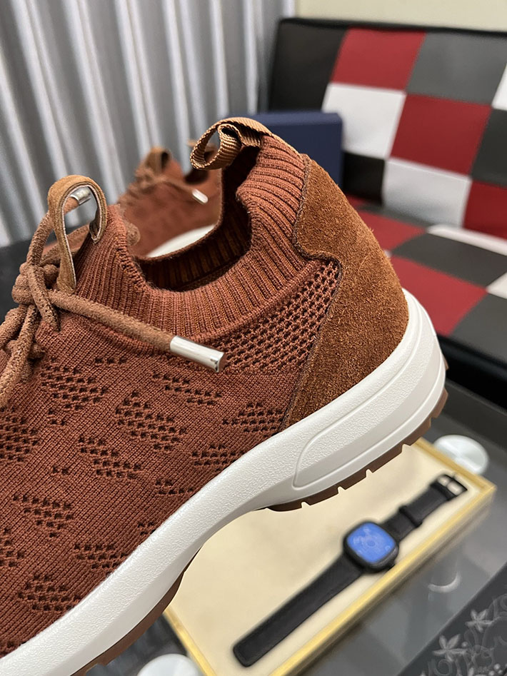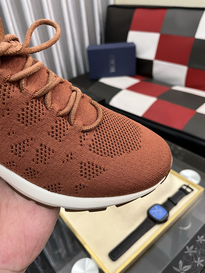 2025年ウィンターシーズンの新作、「B80 ラウンジ」スニーカー。すっきりとしたシルエットと、ディオールらしいクチュールスタイルのディテールが特徴です。カシミヤ、ウール、シルクを使用したブラウンのニットに、アイコニックな「カナージュ」モチーフをさりげなくあしらい、同系色のスエードパネルをかかとに、Diorのエンボス入りパッチをシュータンに施しました。軽やかな履き心地と抜群の快適さを兼ね備えたデザイン。伸縮性のある履き口、リアタブ、スエードの装飾シューレースを備えているため、さっと履くことができます。Diorシグネチャーが映える、ノッチ入りの厚底スカルプテッド ラバーソールで仕上げました。「Dior Icons (ディオール アイコンズ)」カプセルコレクションのどんなルックとも相性抜群のスニーカーです。