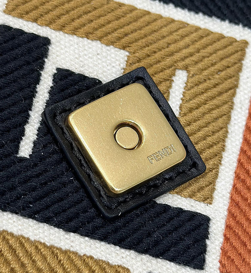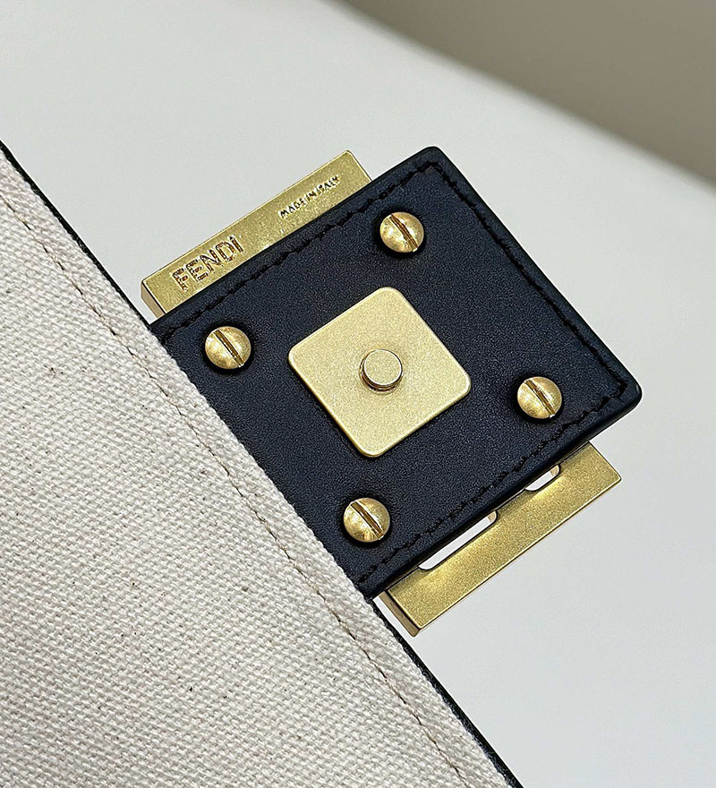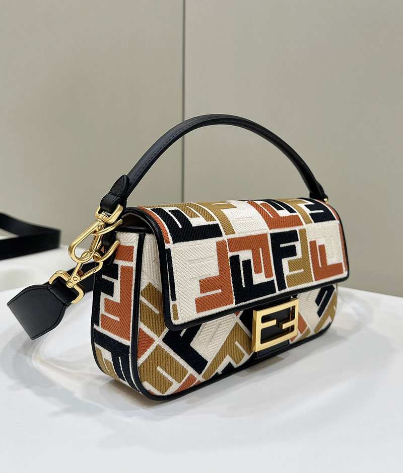 ナチュラルカラーのキャンバスにマルチカラーのブラウン糸で立体的なFFモチーフを刺繍した、ミディアムサイズのアイコニックなバゲットバッグ。ブラックのレザートリミングとFFモチーフの留め具。