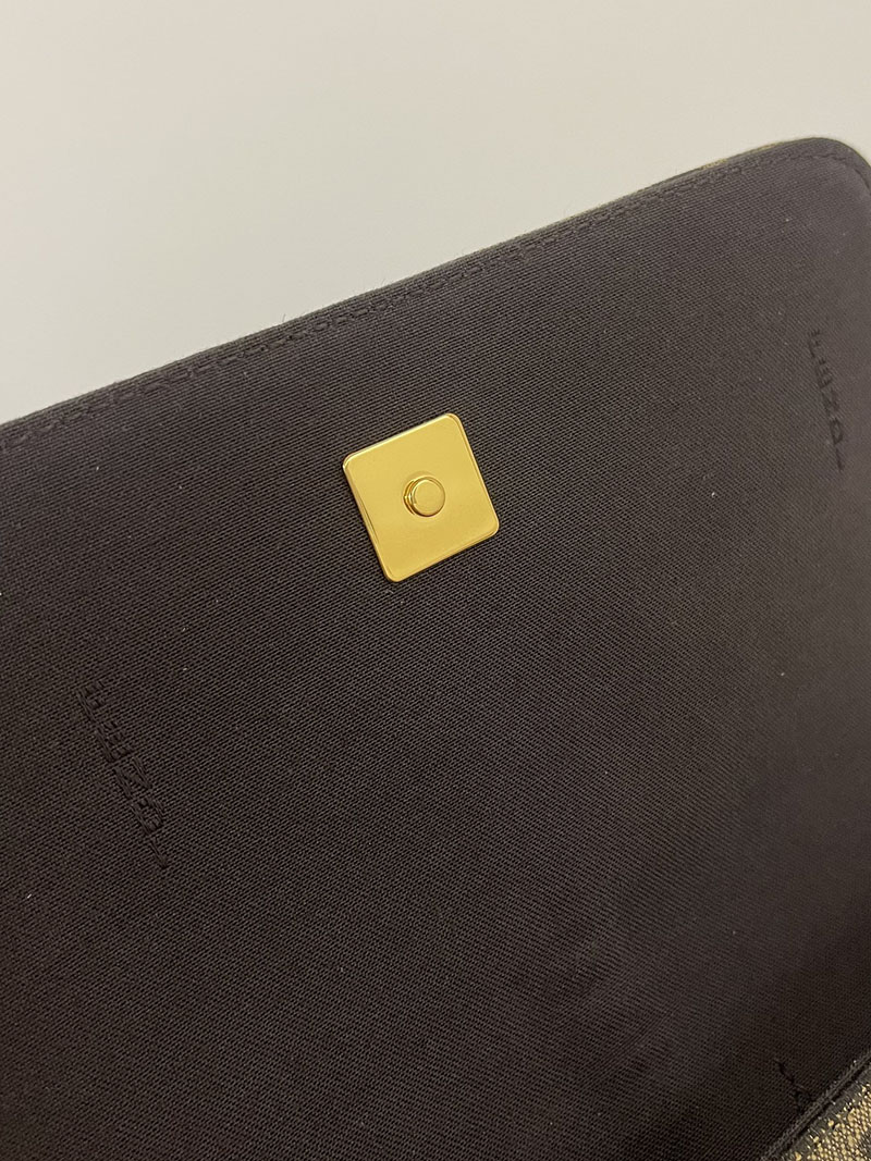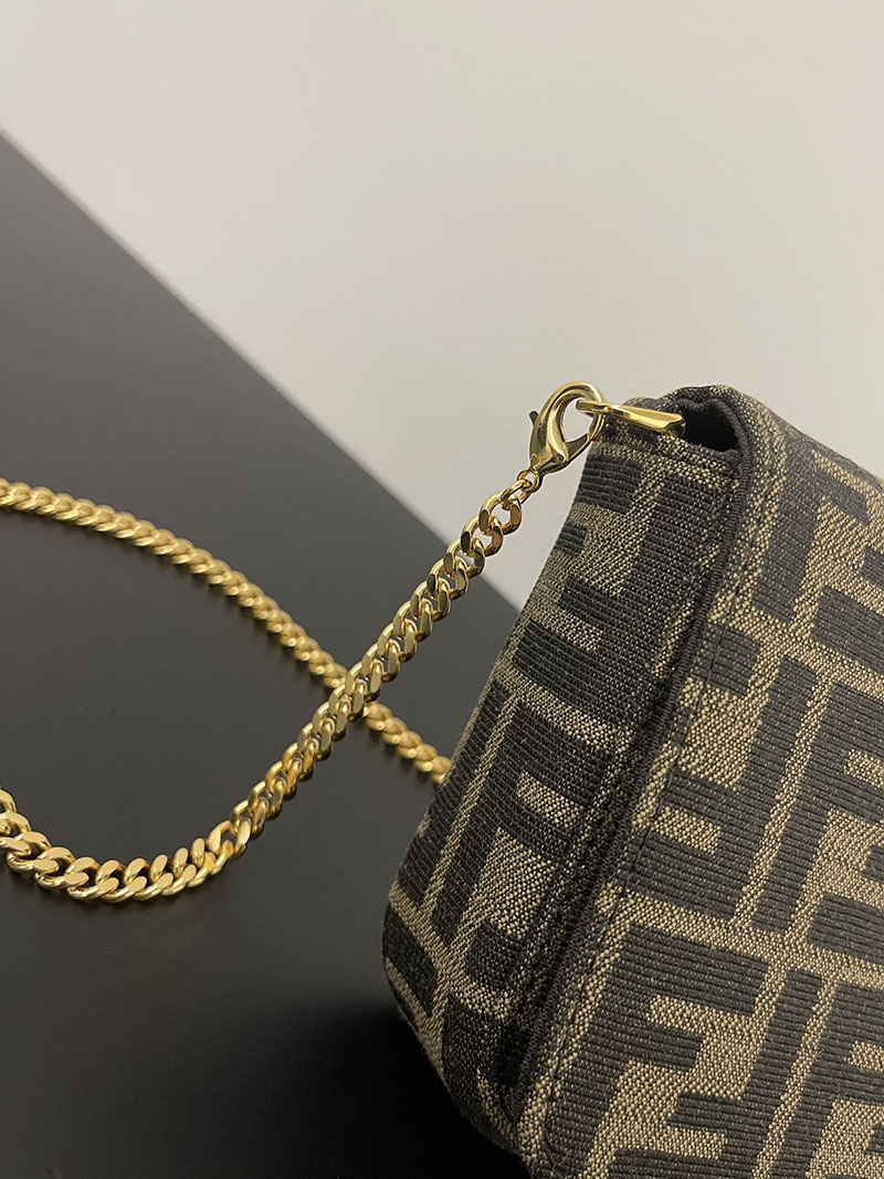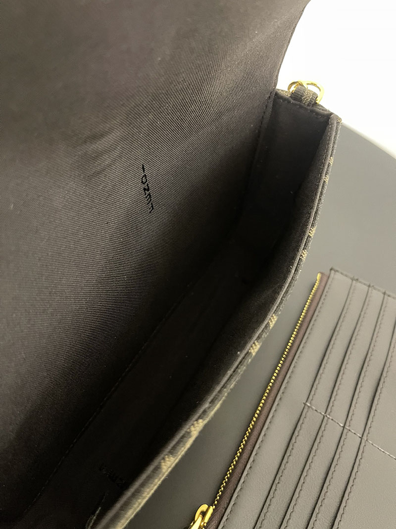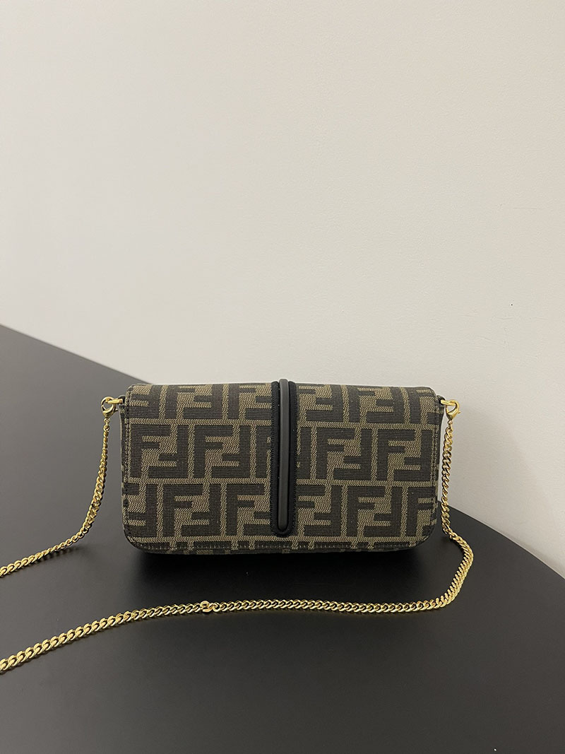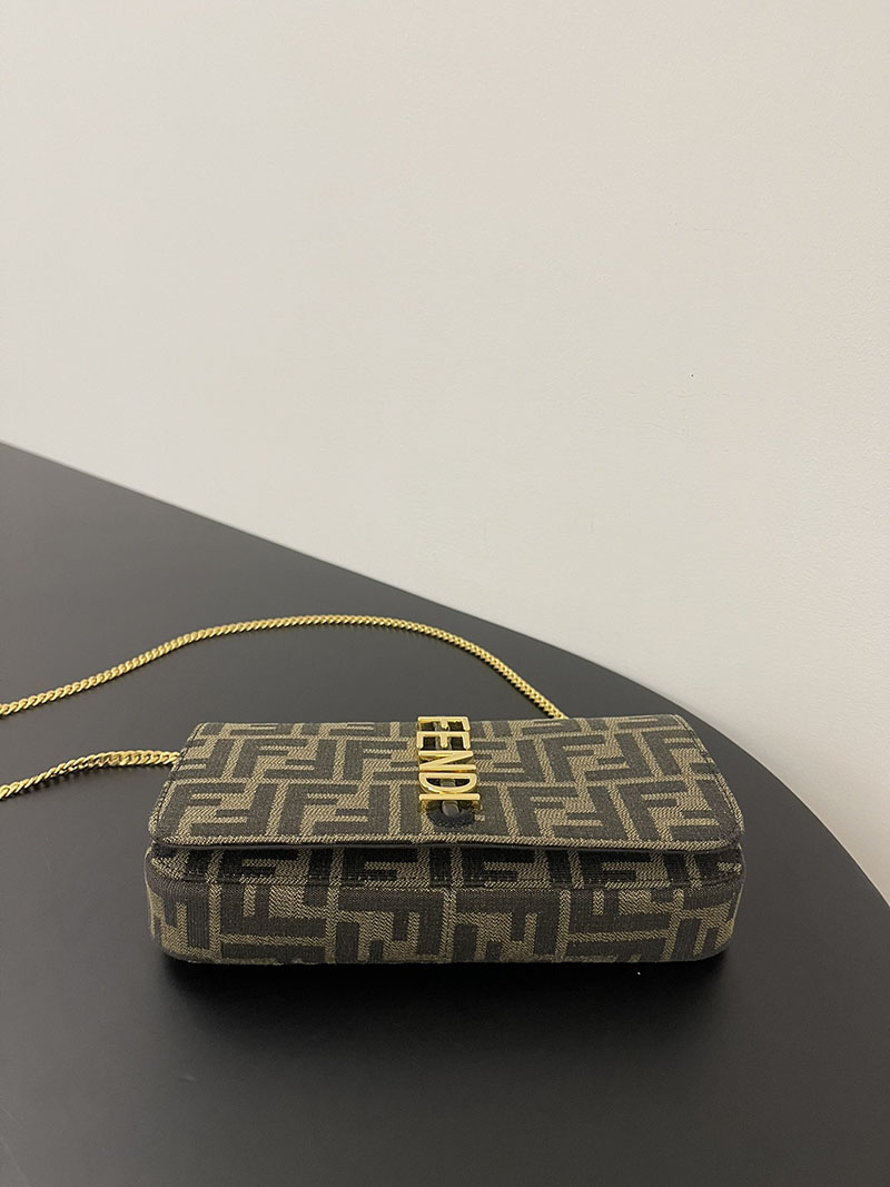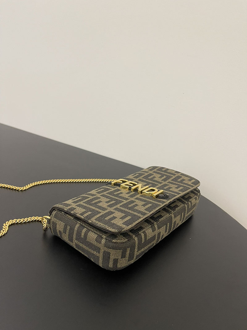 フラップとメタルのFENDIレタリングをあしらった、コンパクトなフェンディグラフィ財布。カードスロットx8とジップポケットを備えた、取り外し可能なインナーポーチ付き。取り外し可能な細身のチェーンショルダーストラップ。ブラウンのFFモチーフをあしらった、ジャカードファブリック製。メタルパーツはゴールド仕上げ。