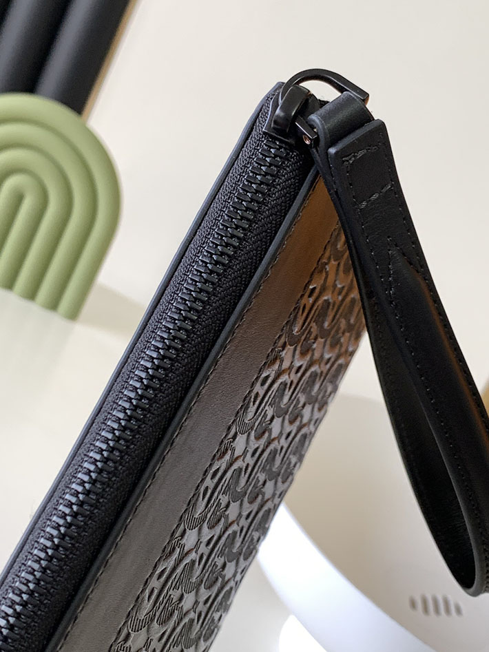 エンボス加工されたガンチーニ・モノグラムが印象的なクラッチバッグ。リストストラップ付きで持ち運びに便利です。