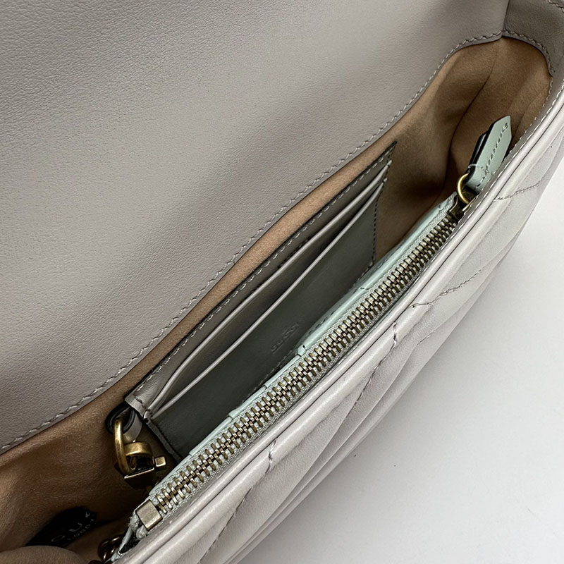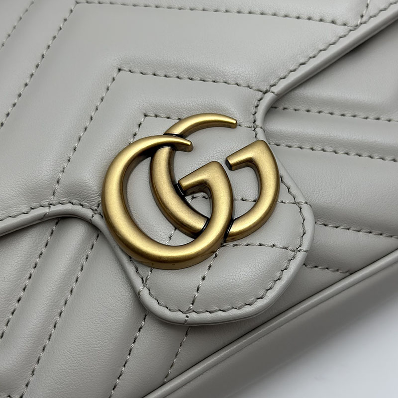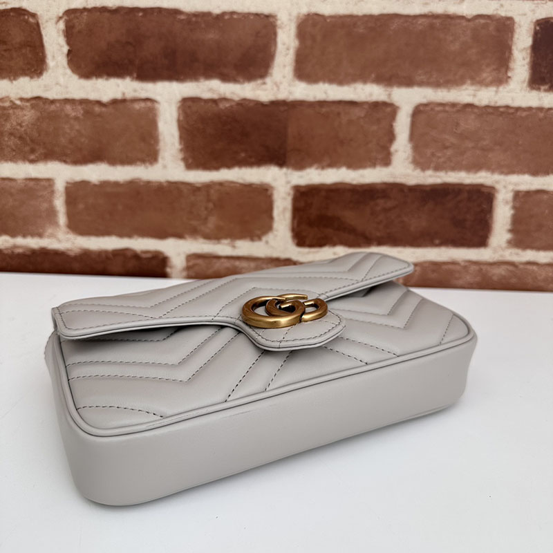 ライトグレーのシェブロン キルティングレザーで仕立てた、〔GGマーモント〕ミニバッグ。シグネチャーであるアンティークゴールドトーンのダブルG ハードウェアを飾り、取り外し可能なレザー カードケースを配しました。