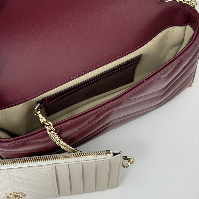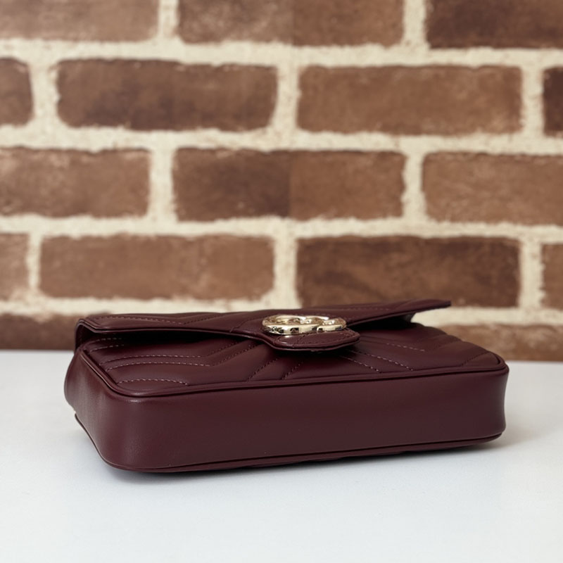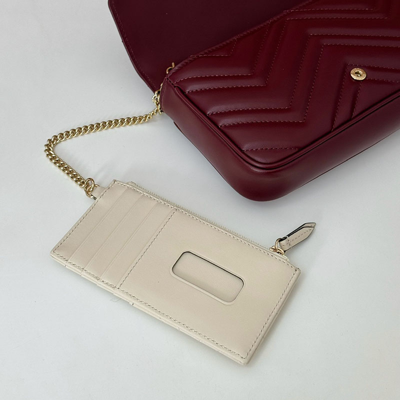この〔GGマーモント〕ミニバッグは、新しいグッチ ロッソ アンコーラ レッドのシェブロン キルティングレザーで仕立てています。シグネチャーであるライトゴールドトーンのダブルG ハードウェアを飾り、コントラストの際立つホワイト レザーを用いた取り外し可能なレザー カードケースを配しました。