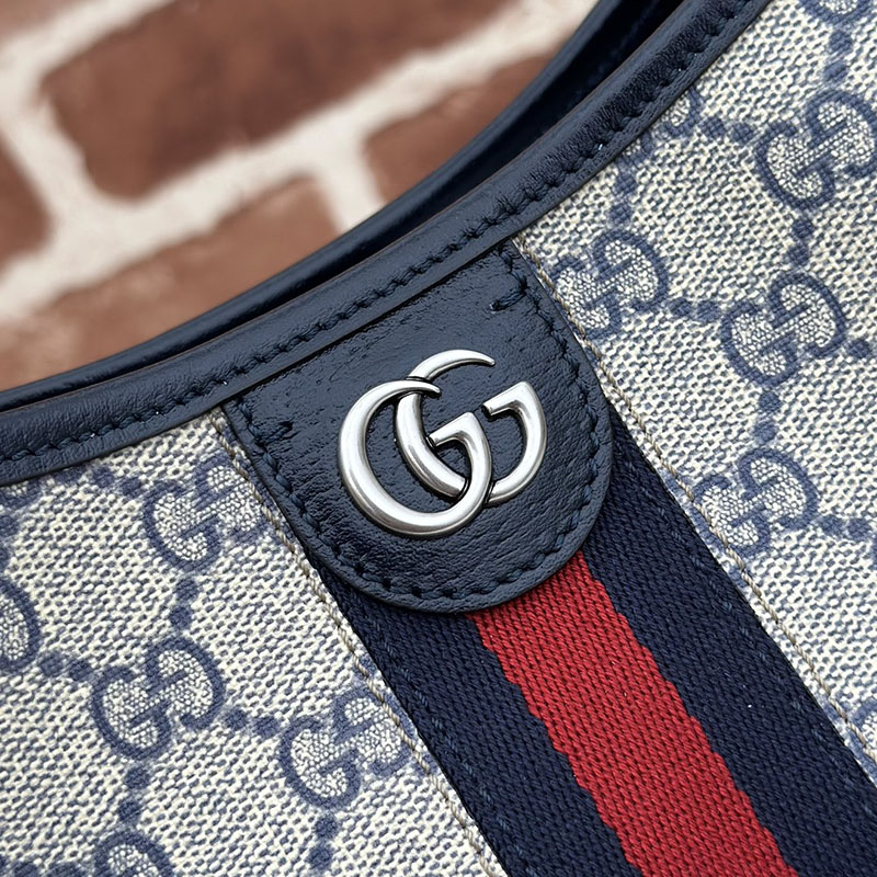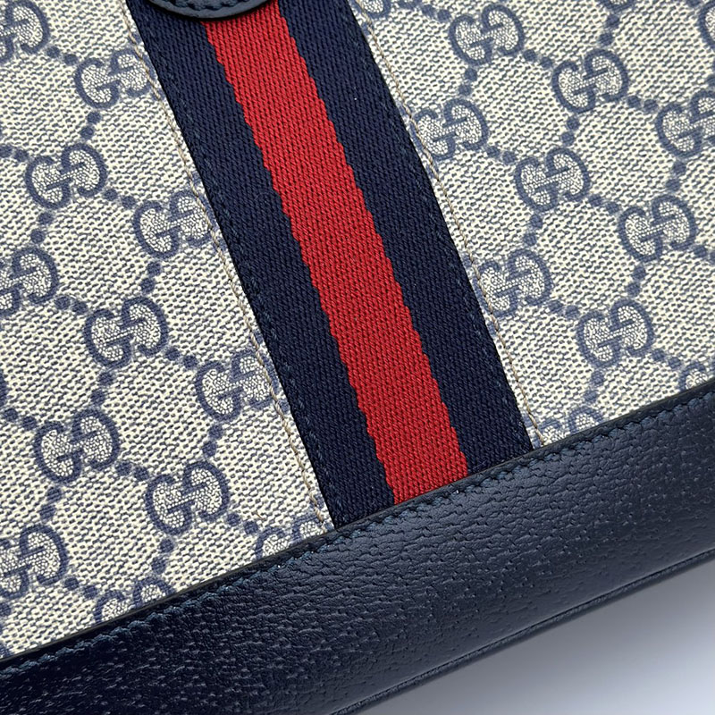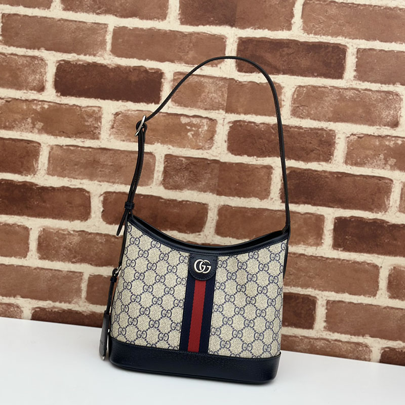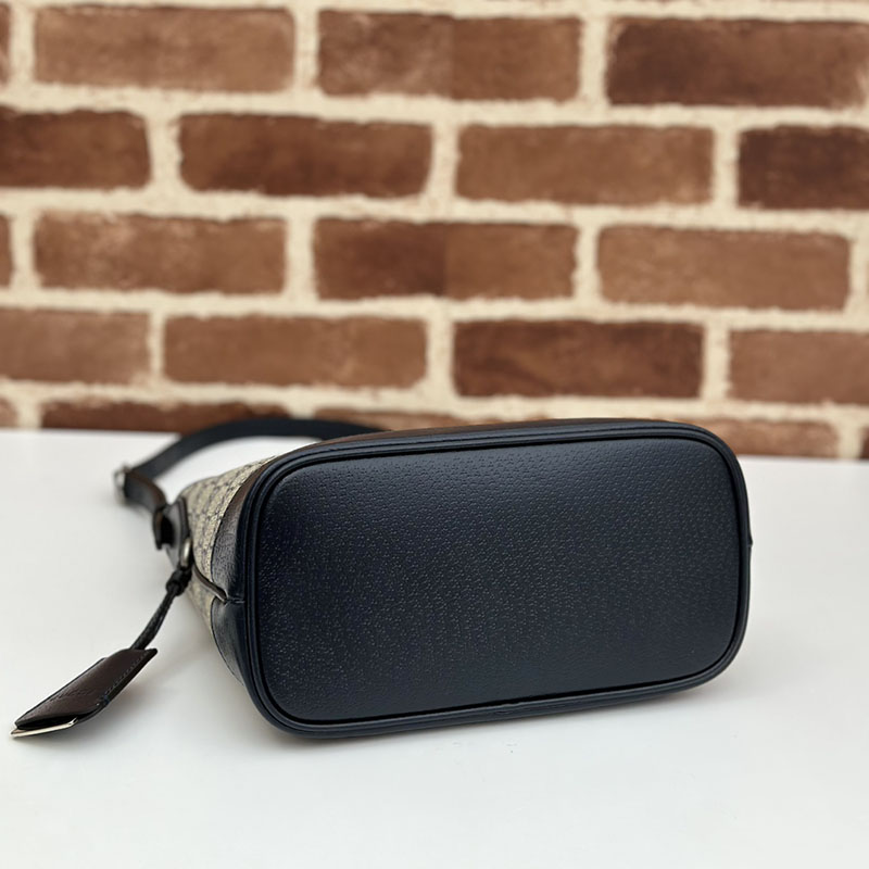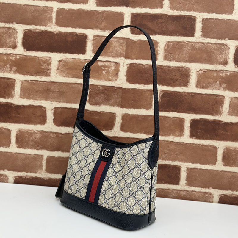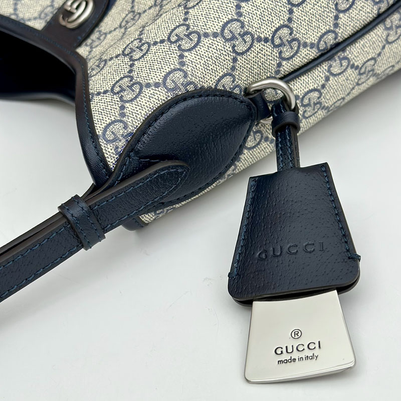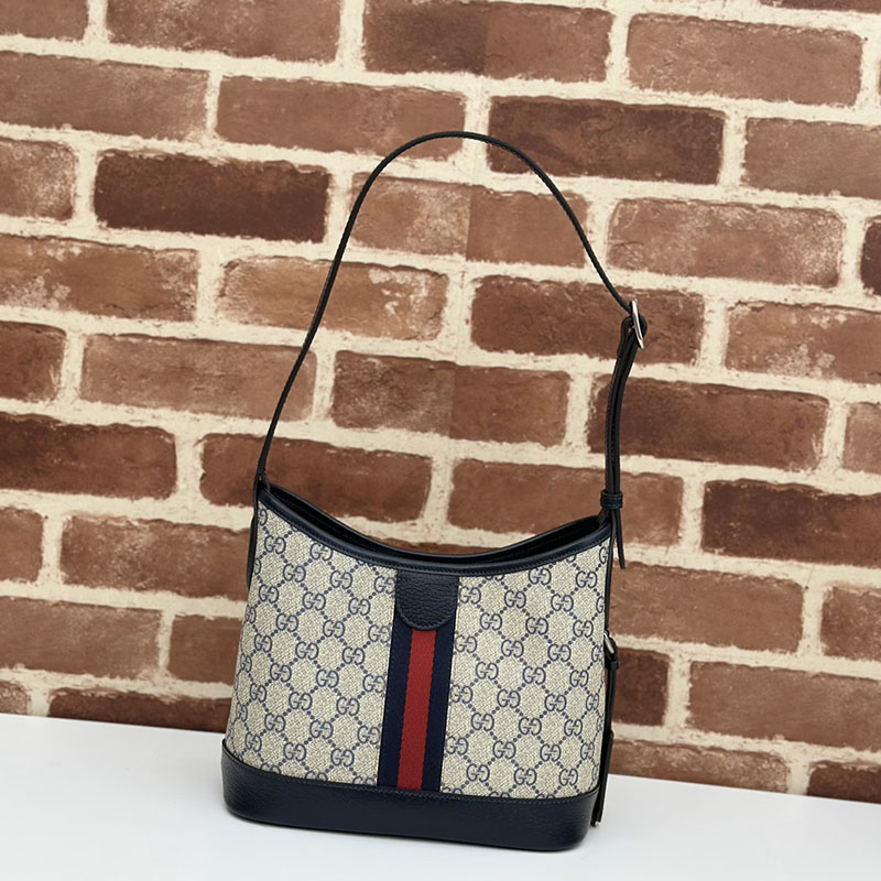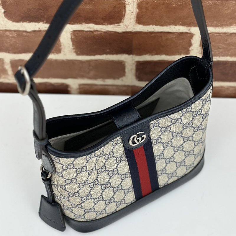 〔オフィディア〕ラインに登場したこのスモールサイズのバッグは、オープンバケットのデザインとショルダーバッグのスタイルを組み合わせ、新たに意表を突くアレンジを加えました。ベージュ&ブルーのカラーコンビネーションに仕上げた、グッチを象徴するGGスプリーム キャンバスで仕立てています。