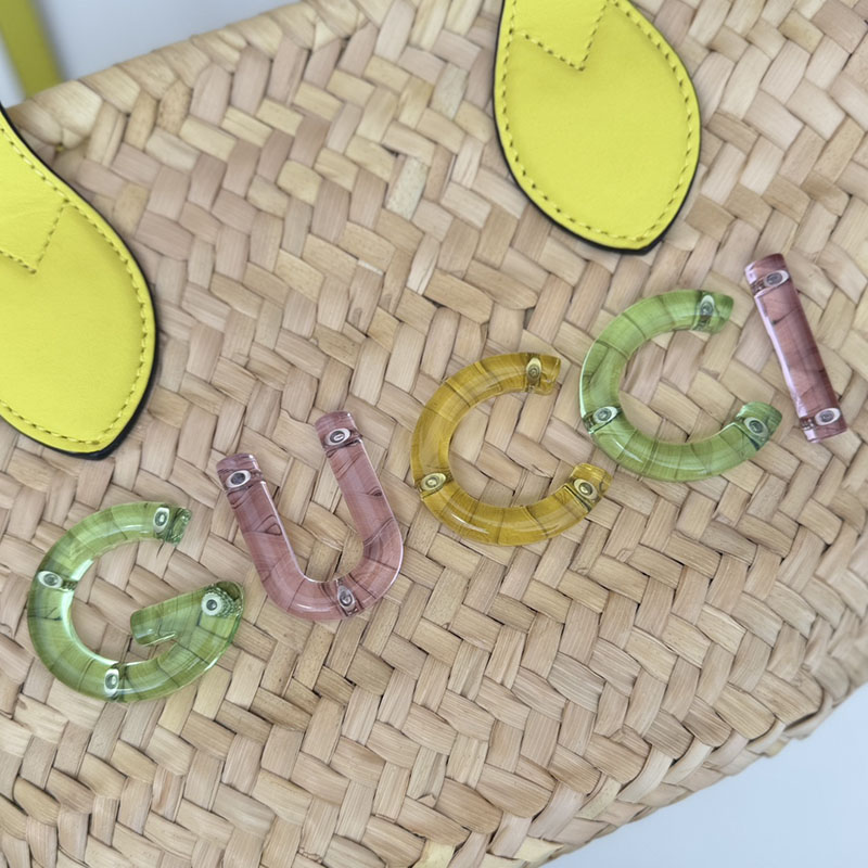 このアイテムは、夏のスピリットとイタリアのビーチクラブに着想を得た Gucci Lido(グッチ リド)コレクションのひとつです。ストローを使ったグッチのアクセサリーは、伝統素材に鮮やかなカラーや象徴的なモチーフを用いて新たな光を投げかけています。このミニ トートバッグでは、ナチュラルカラーのベースにイエローのレザー ストラップを配しました。GUCCI ロゴをマルチカラーのプレキシグラスであしらい、陽射しが降り注ぐ季節に映える一品に仕上げています。