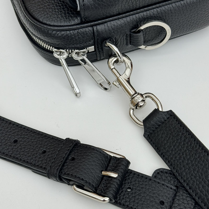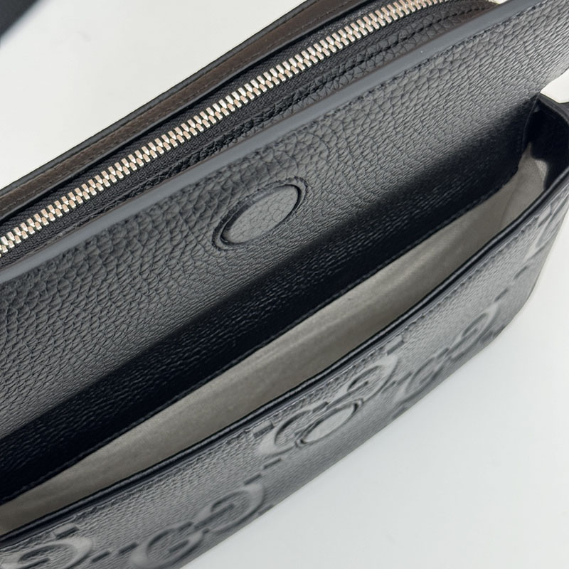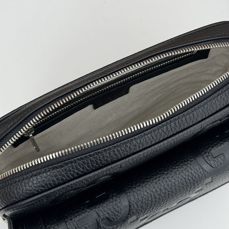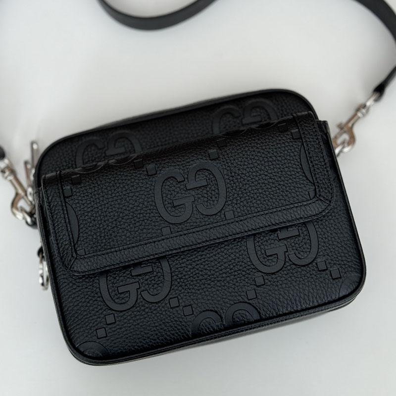今シーズンもコレクションを彩る、グッチのロゴをマキシサイズにアレンジしたジャンボ GG。最新コレクションでは、グッチのアイコニックの一つであるGGパターンを、普段の装いになじむブラックに仕上げています。内側にジップポケット、外側にフラップポケットを備えたこのクロスボディバッグにも、GGパターンをあしらいました。