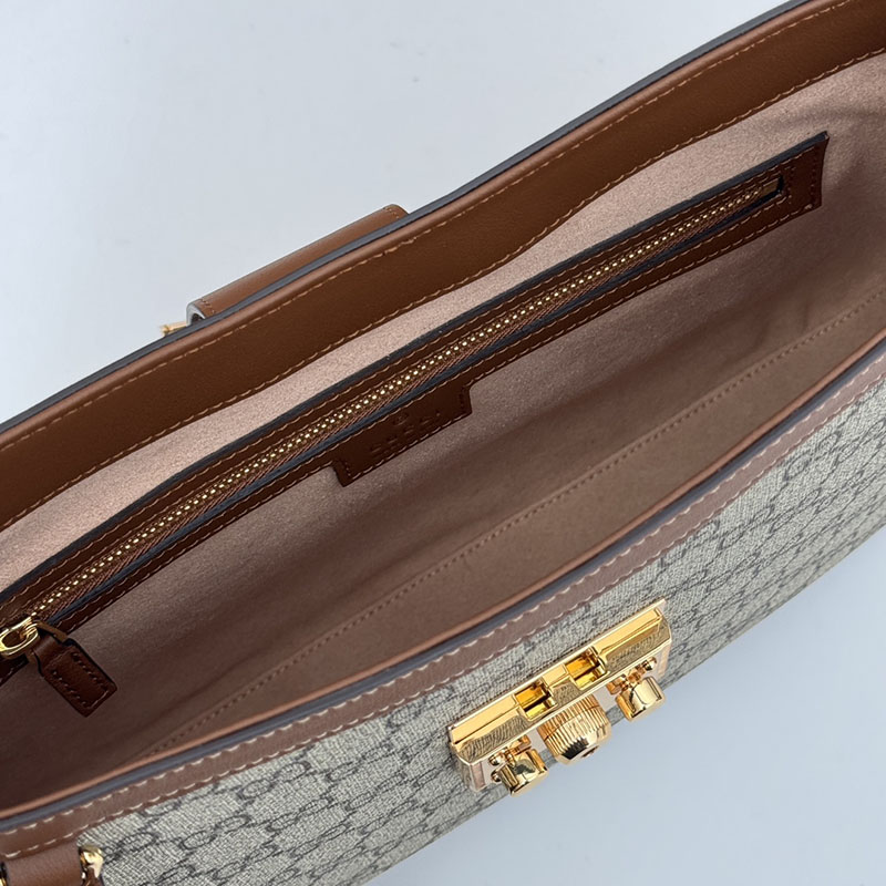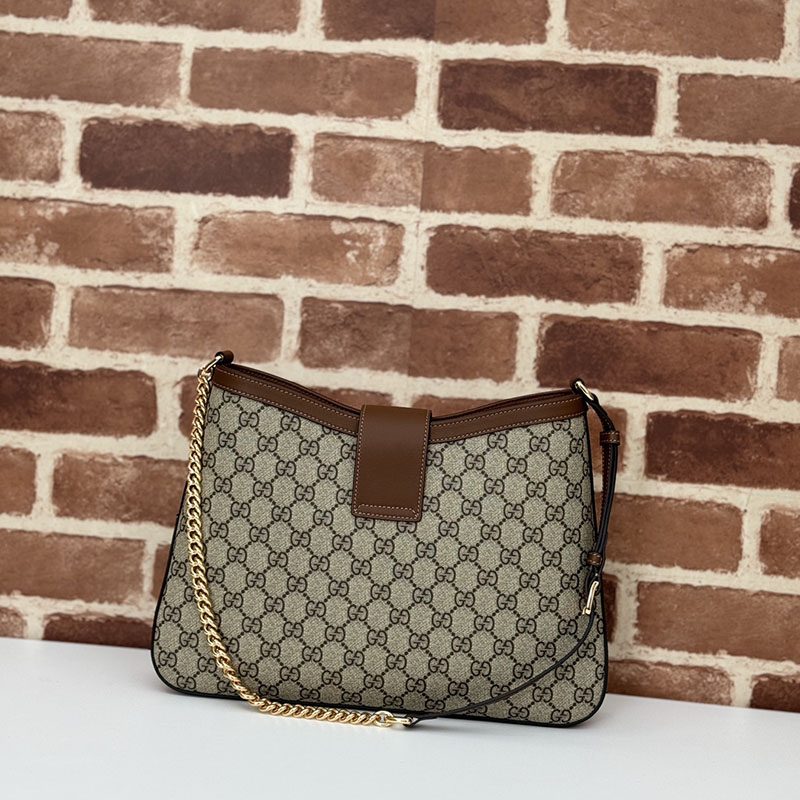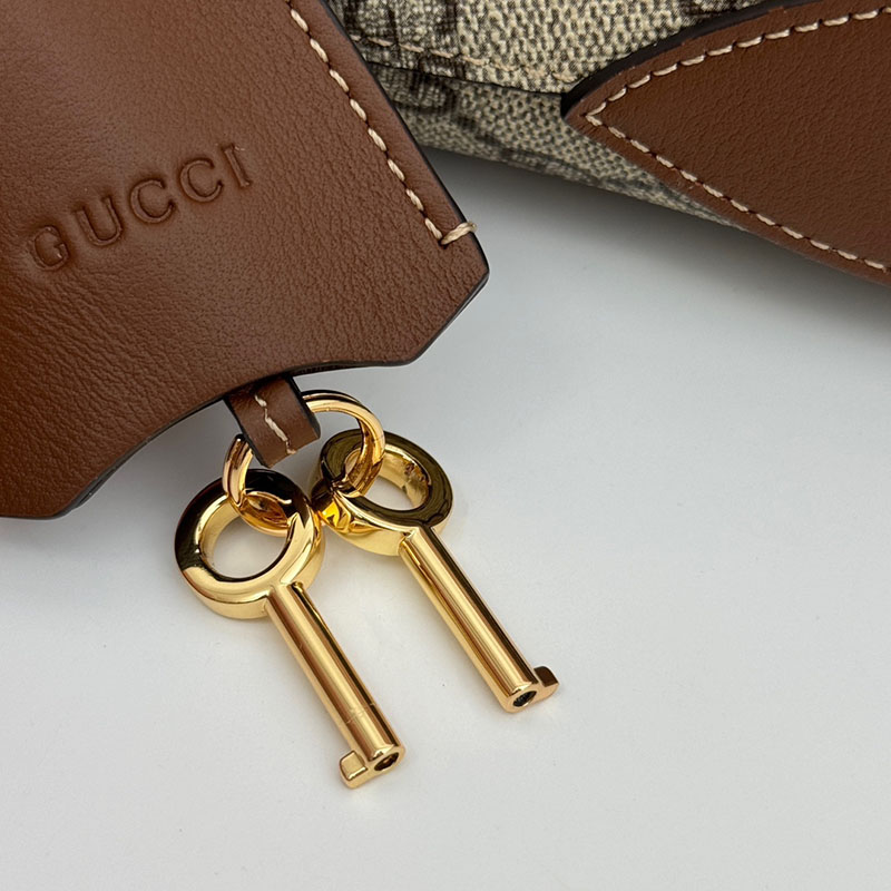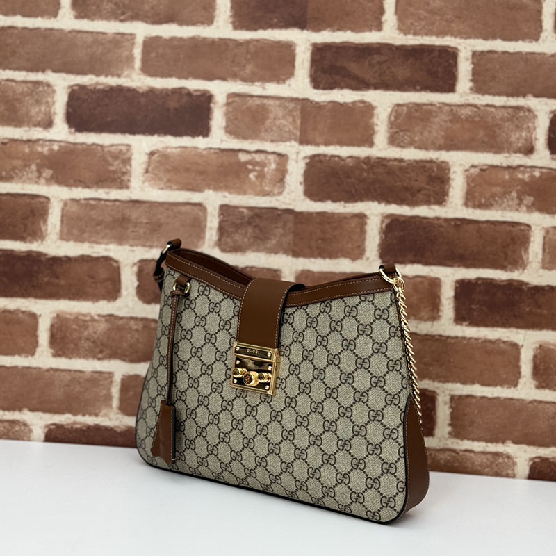 職人によるラゲージの工房として始まったグッチのルーツを受け継ぐクロージャーが光る、GGスプリーム キャンバスで仕立てた〔パドロック〕ショルダーバッグ。ゴールドトーン ハードウェアとなめらかなブラウン レザー トリムをあしらい、チェーン&レザーのショルダーストラップを配しています。