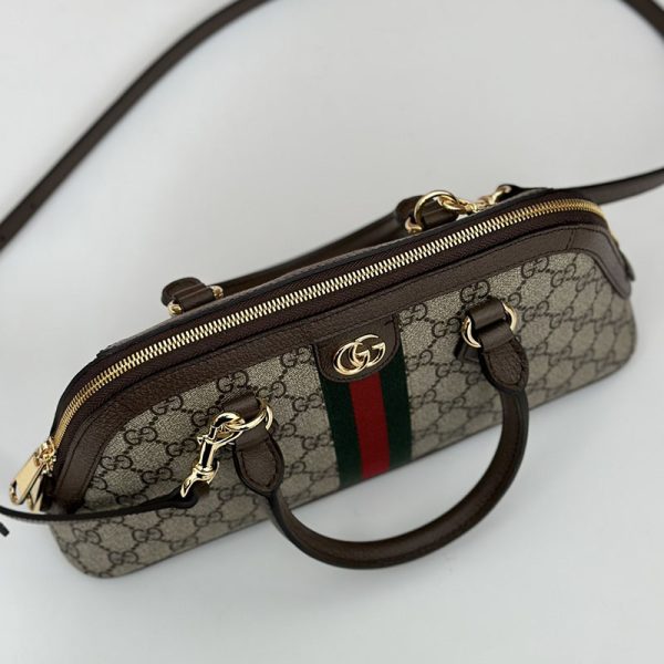 このトップハンドルバッグはベージュ&エボニーのGGスプリーム キャンバスで仕立て、取り外し&調節可能なショルダーストラップを配しました。