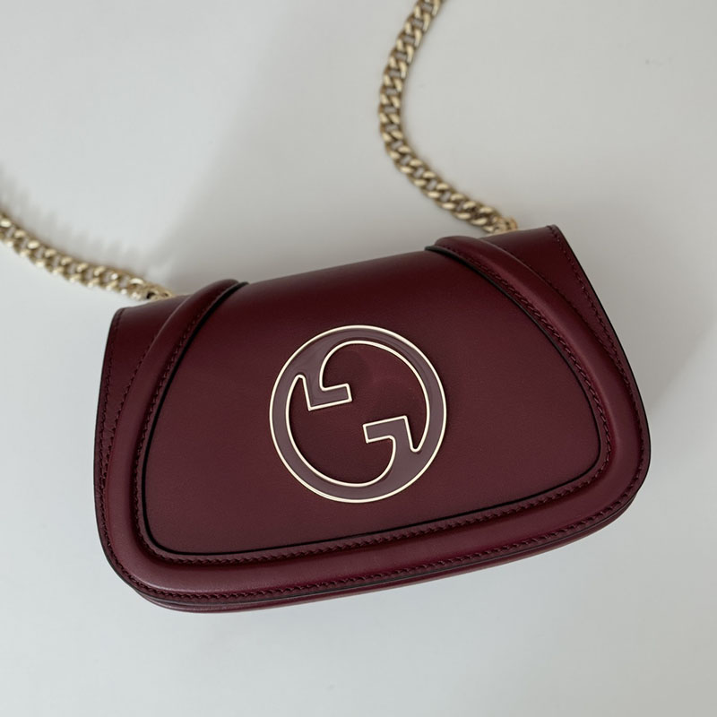 1970年代初頭のグッチのコレクションで登場した〔グッチ ブロンディ〕は、グッチのアイコニックであるラウンドインターロッキングGのモチーフが特徴で、過去と現在を織り交ぜてノスタルジアとモダンを両立させたバッグです。ゴールドトーンのチェーンを備えたこのミニ ショルダーバッグは、グッチ ロッソ アンコーラ(深い赤)レザーで仕立て、ラッカーフィニッシュのラウンド インターロッキングGをあしらいました。