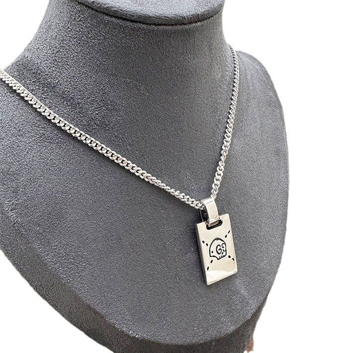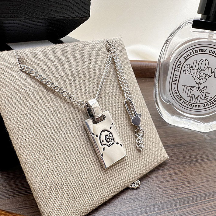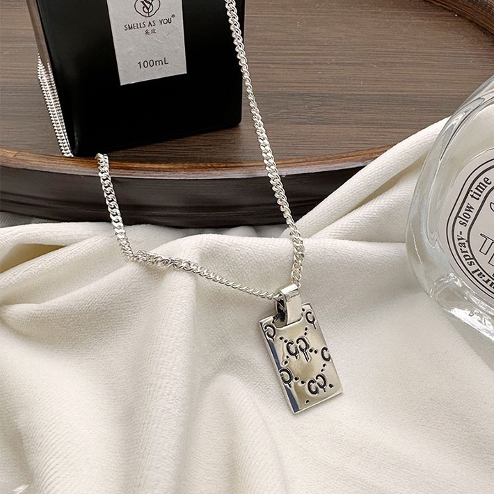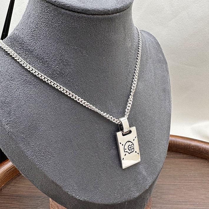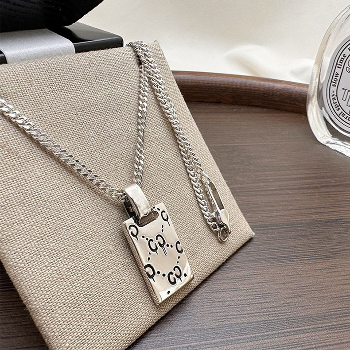 デイリー使いのアイテムに、GGモチーフが現代的な雰囲気とスタイリングの気軽さをプラスします。光沢のあるスターリングシルバーに、エングレービングでロゴとドットのデザインを描き出し、酸化を防ぐためコーティング加工を施しました。このチェーンネックレスでは、そのモチーフをタグ ペンダントとして配しています。
