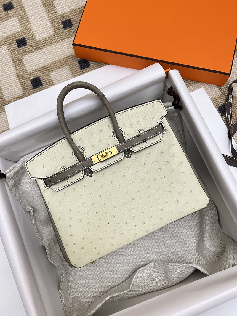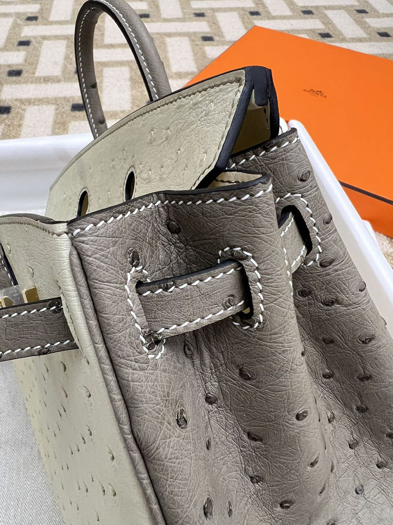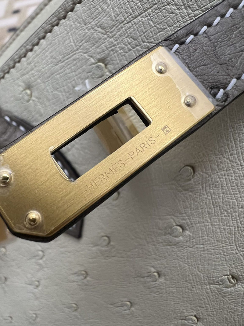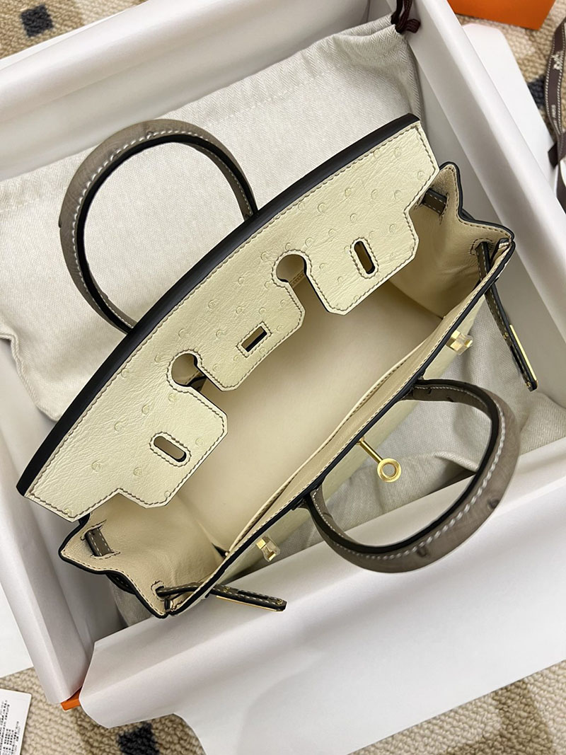 Birkin 25CM KK Ostrich Leather 3C Parchemin / M8 Gris Asphalt Brush Gold Hardware
