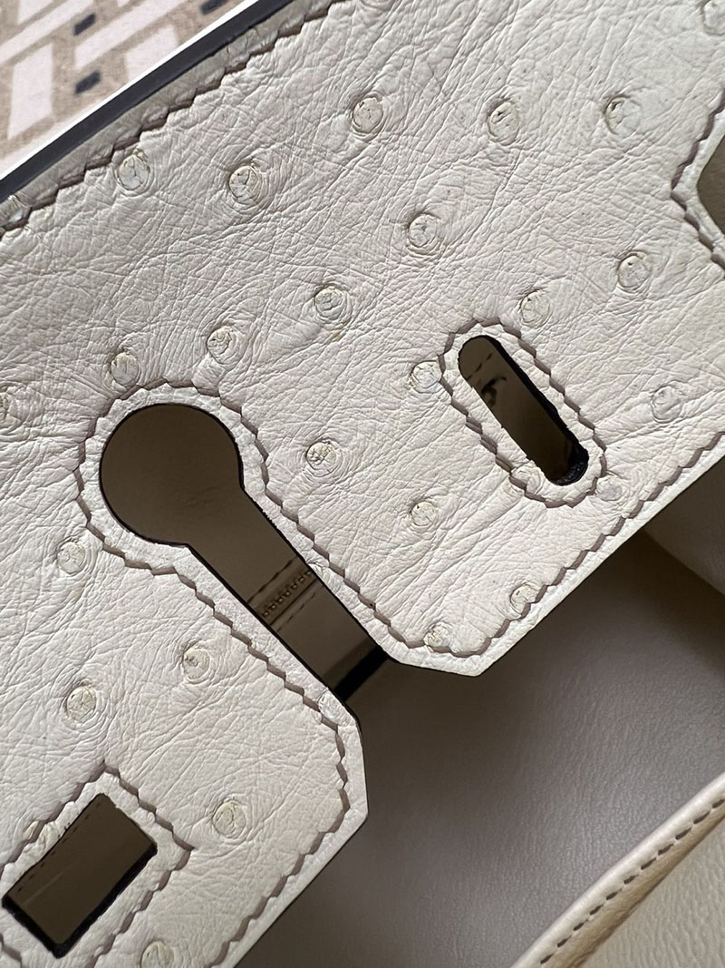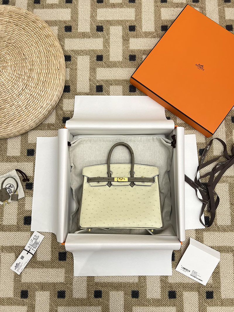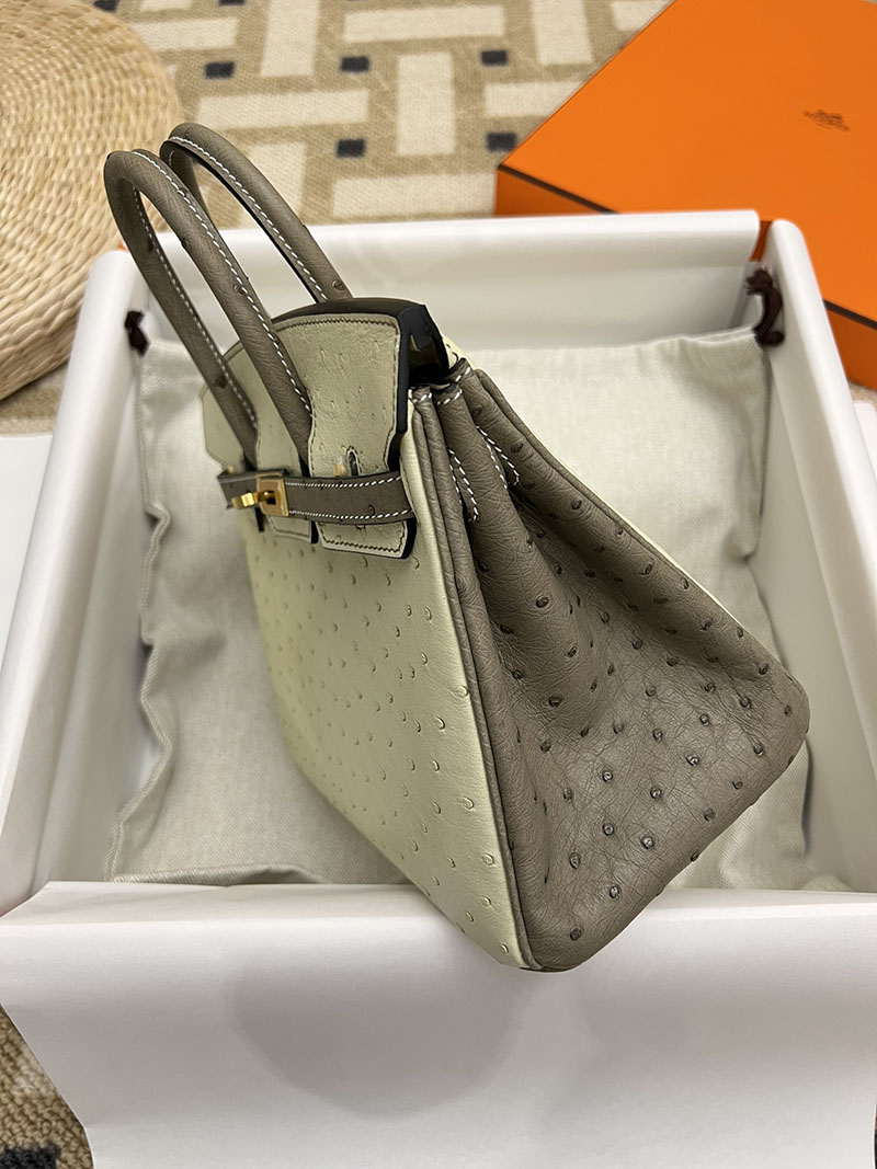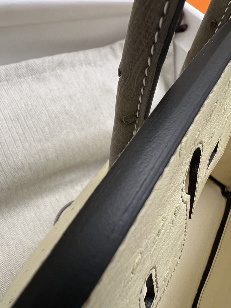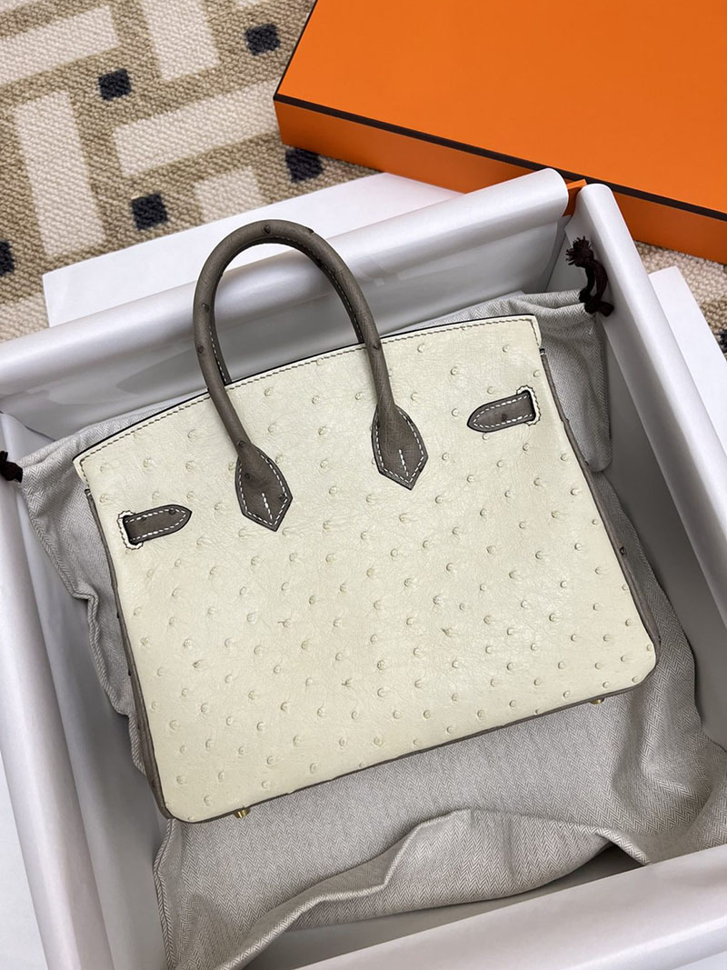 Birkin 25CM KK Ostrich Leather 3C Parchemin / M8 Gris Asphalt Brush Gold Hardware