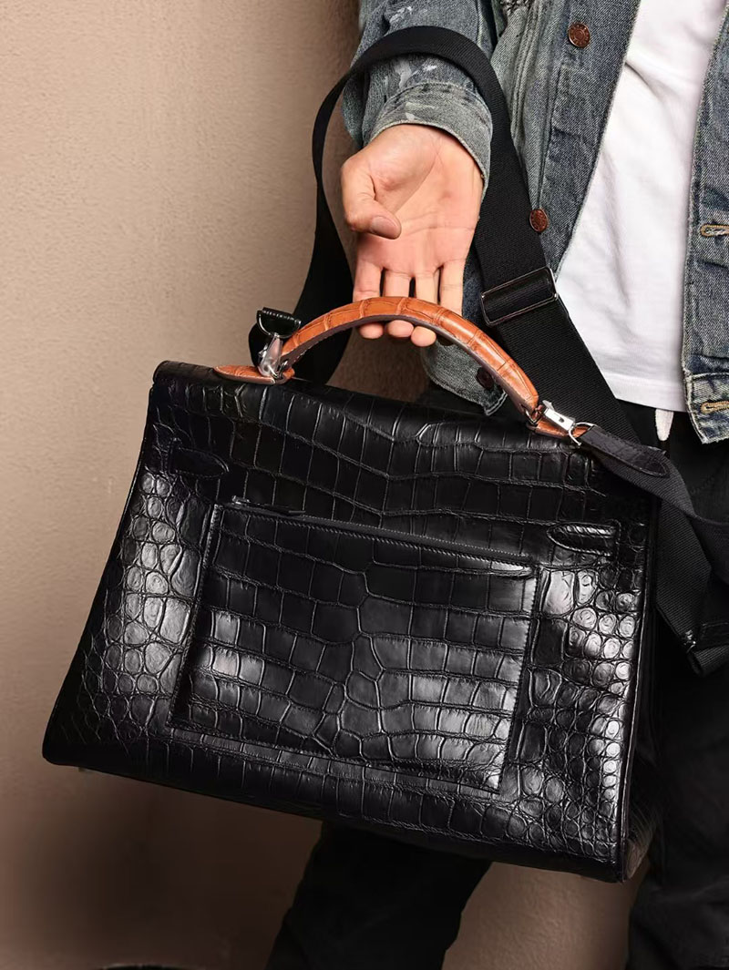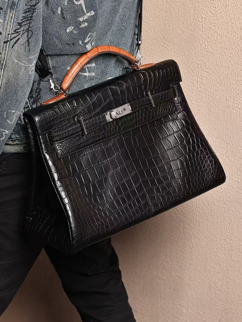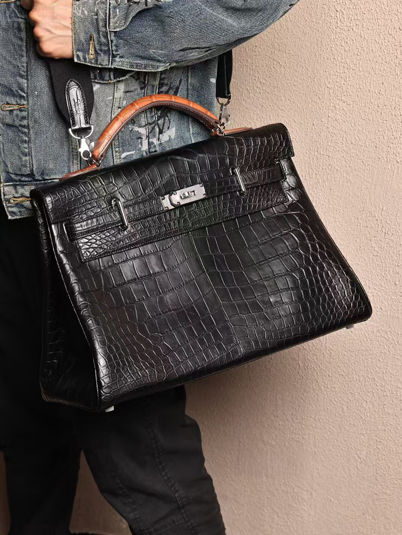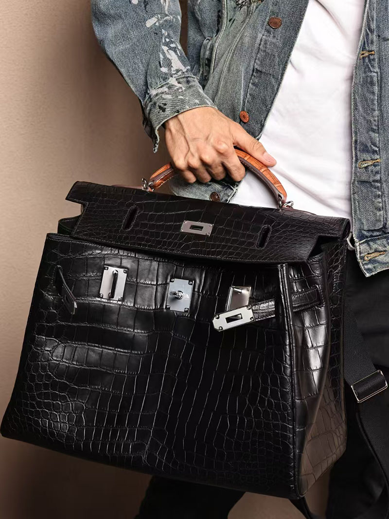 エルメス メンズバッグ 新作 HERMES マキシケリー 42cm 内縫い 黒/ゴールド クロコダイル ニロティカスマット シルバー金具 2524042
