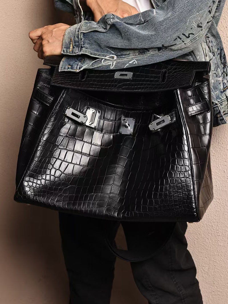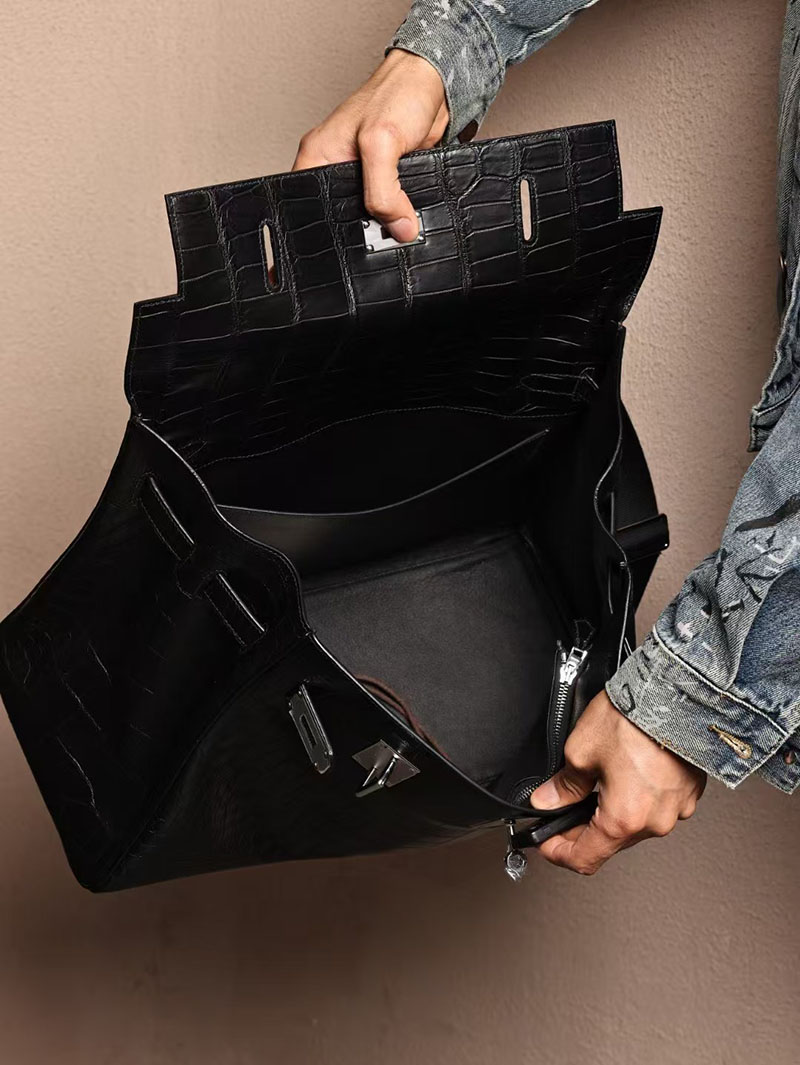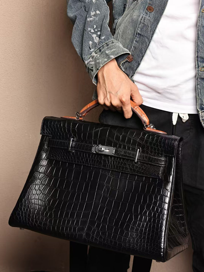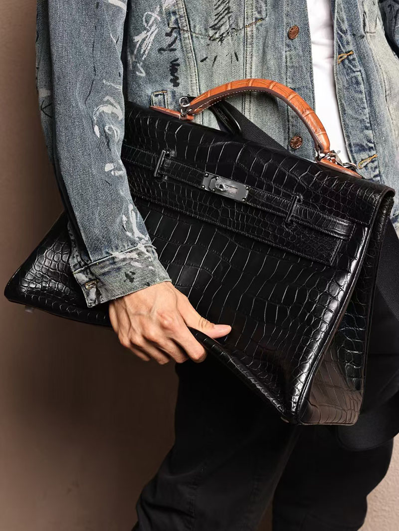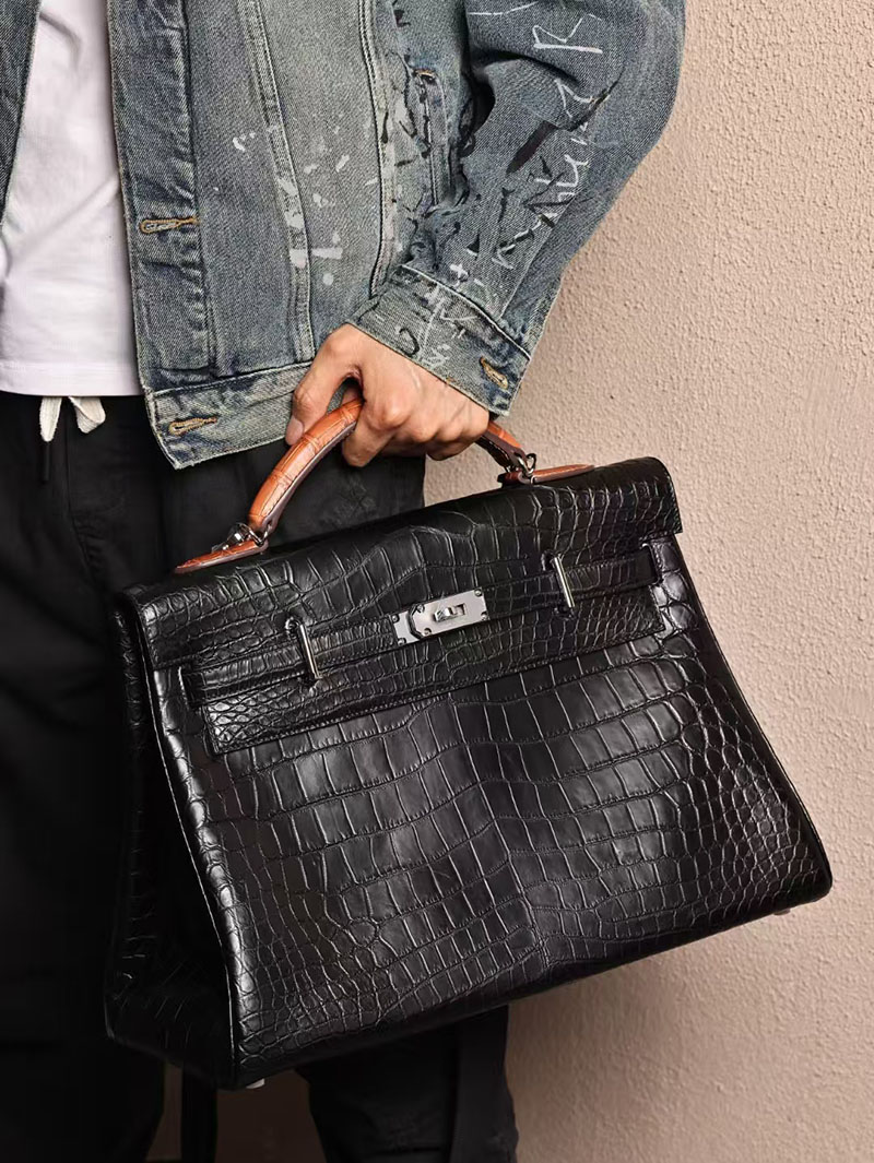 エルメス メンズバッグ 新作 HERMES マキシケリー 42cm 内縫い 黒/ゴールド クロコダイル ニロティカスマット シルバー金具 2524042