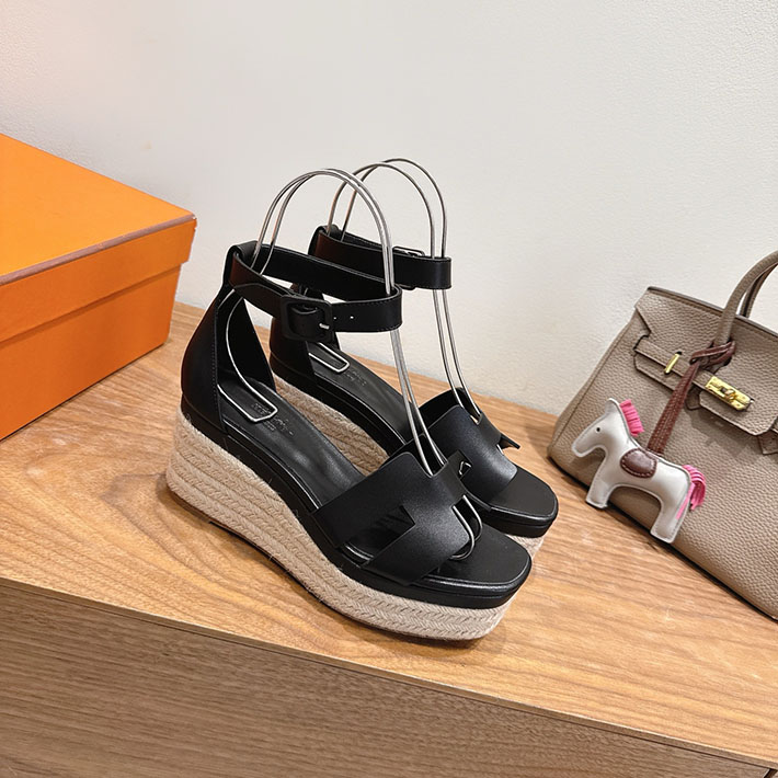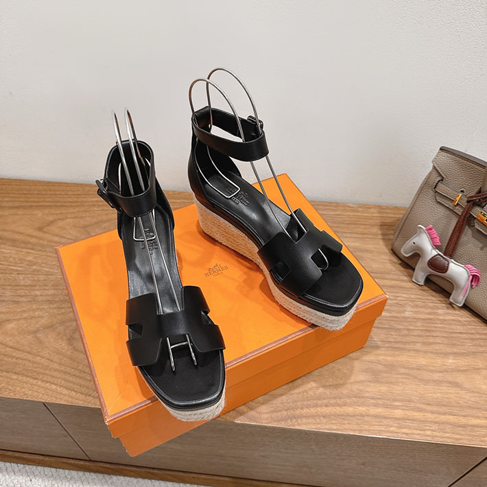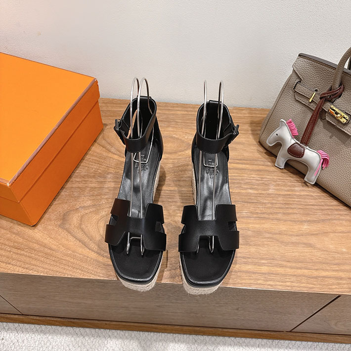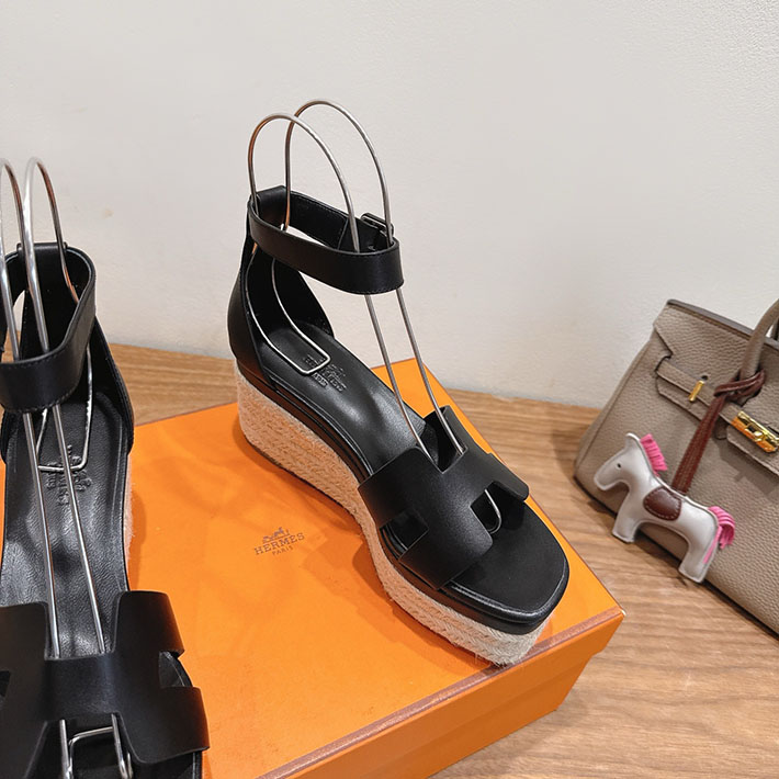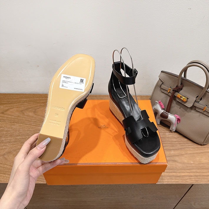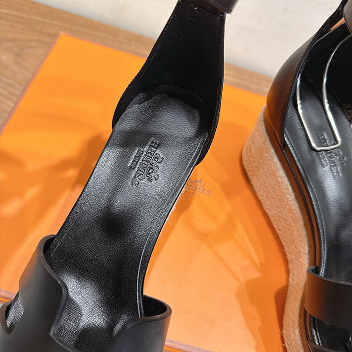 最高級エルメススーパーコピー HERMES エスパドリーユ エルダ ヒール ブラック H231307Zv02390 HERMES 靴 サンダル