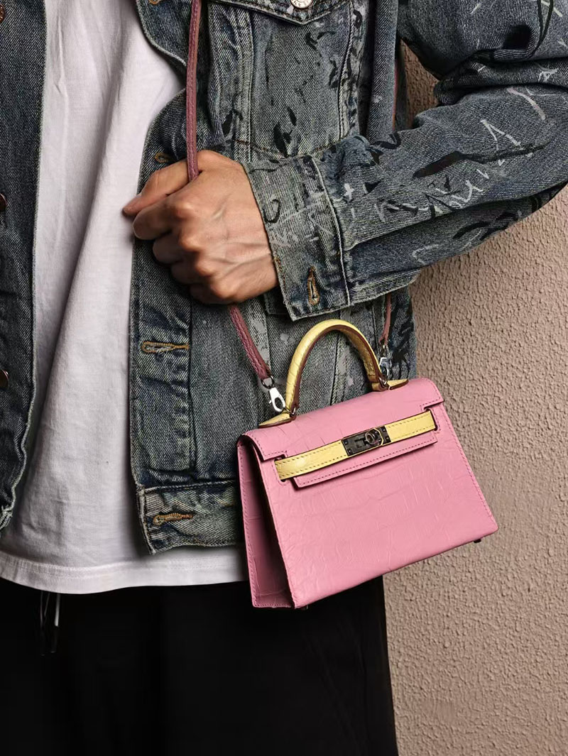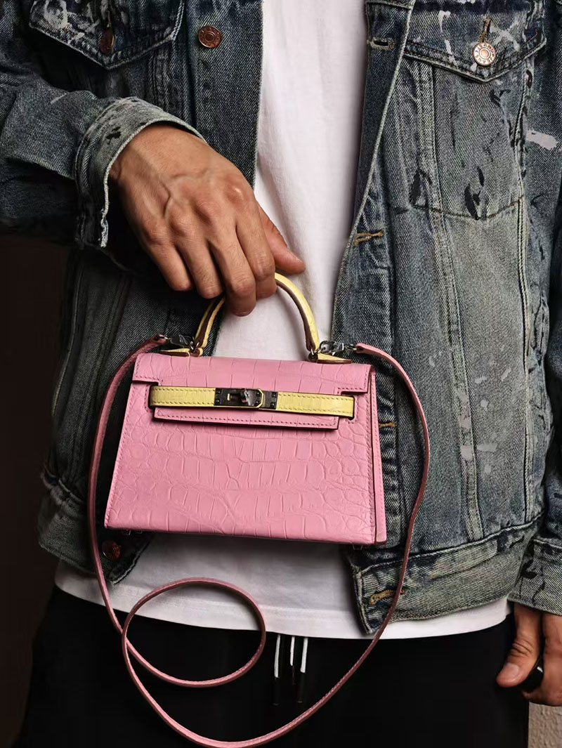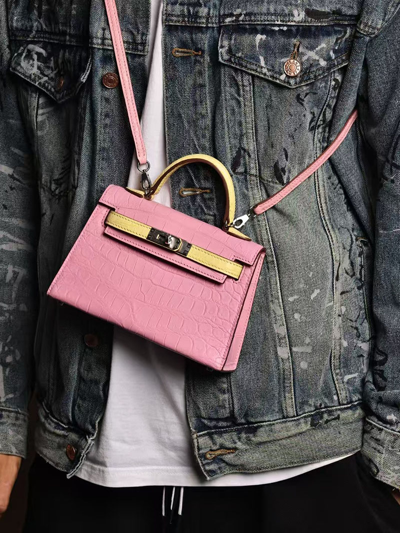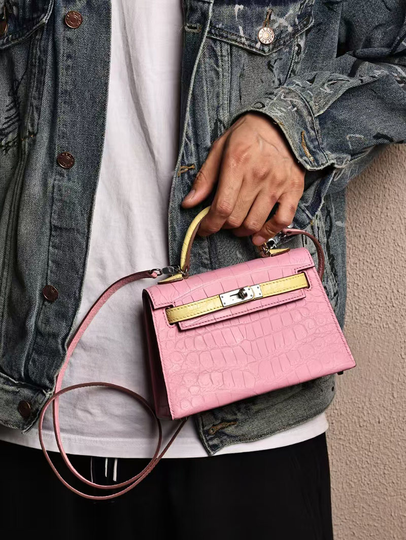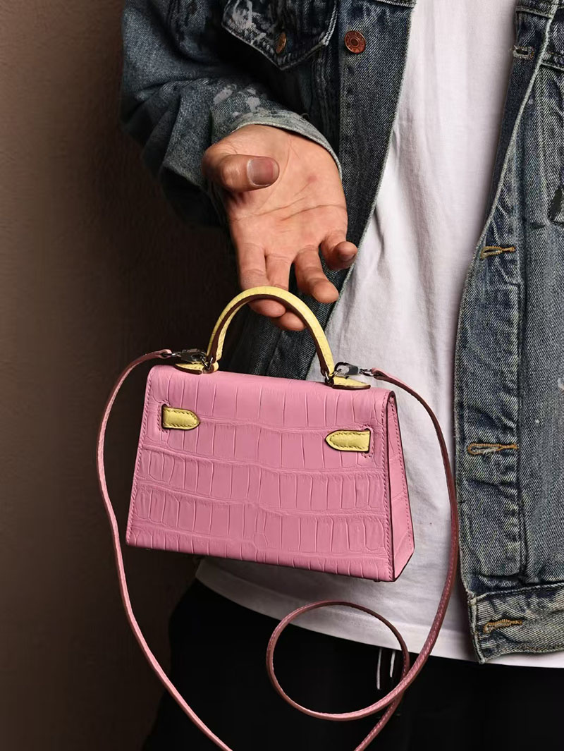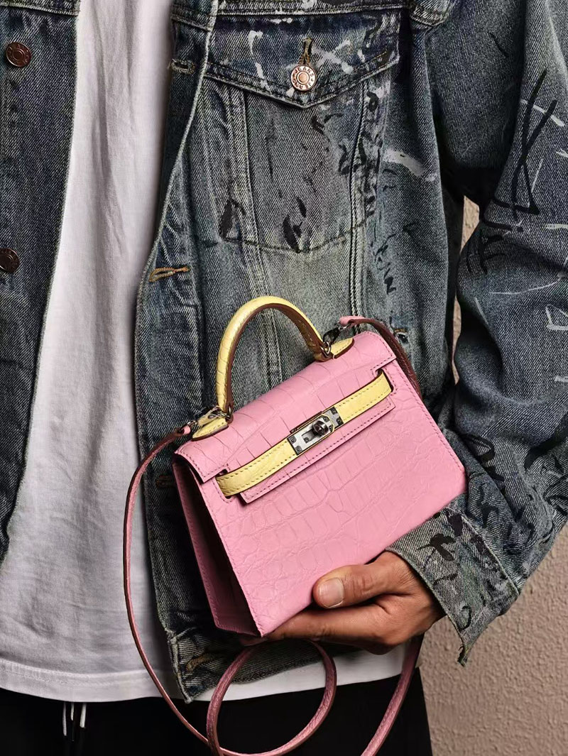 エルメスコピー ミニケリー 定価 HERMES ケリーミニ2 外縫い ローズサクラ/ライム クロコダイル ポロサスマット シルバー金具 2524048