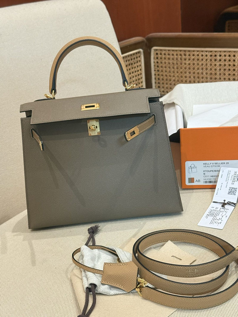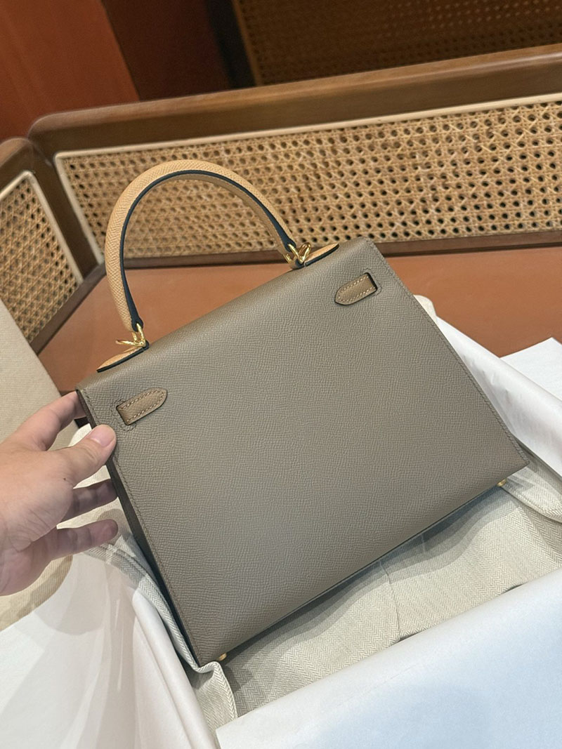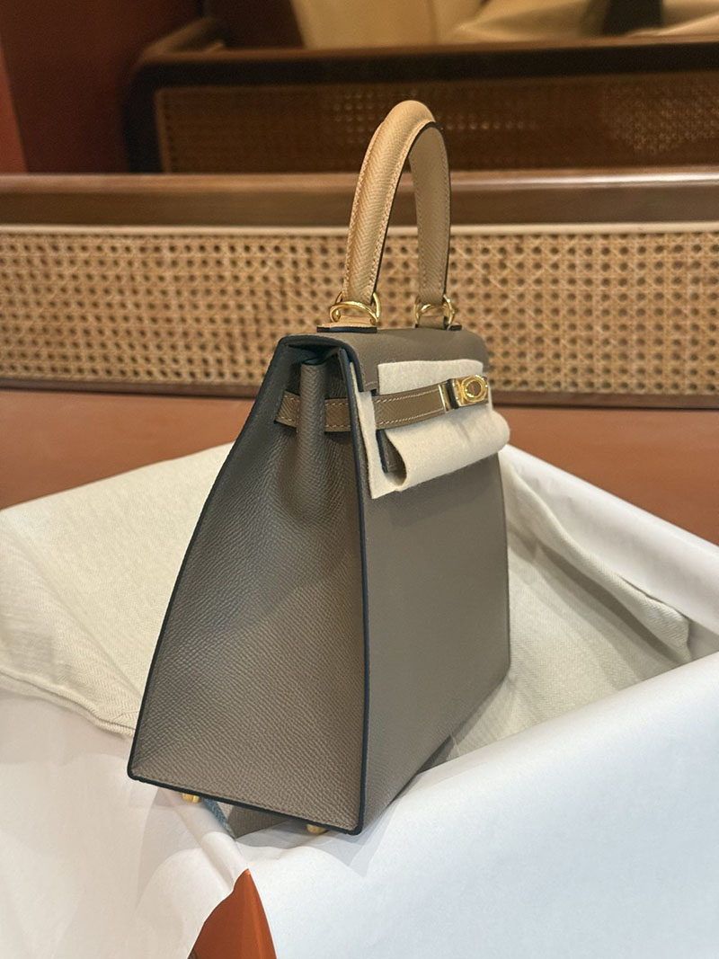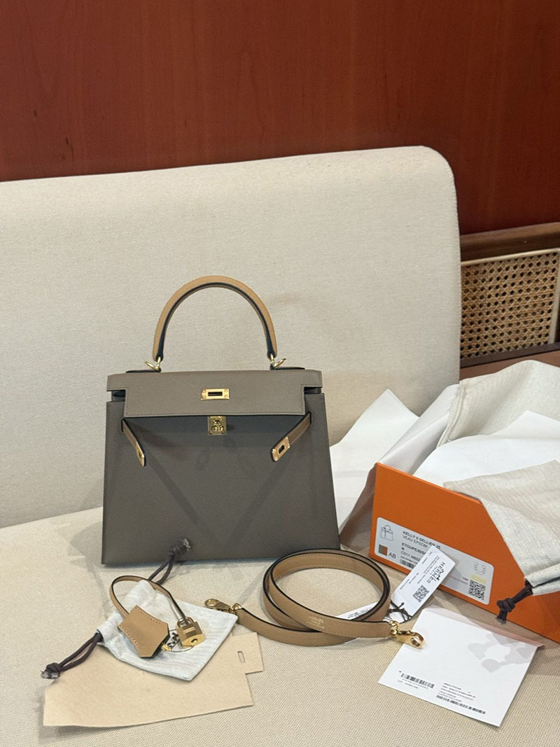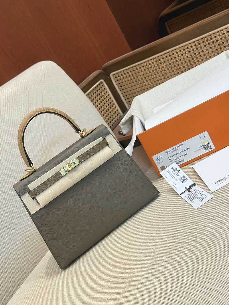 エルメスケリーバッグ定価 HERMES ケリー25 外縫い エトゥープ/ビスキュイ/アルザン ヴォーエプソン ゴールド金具 2524160