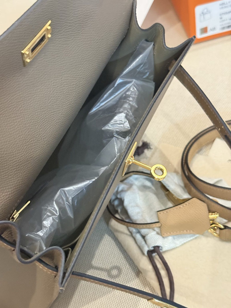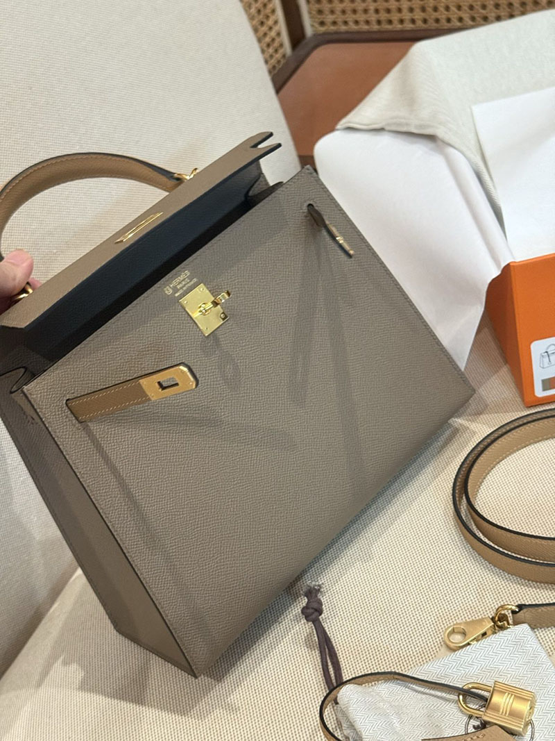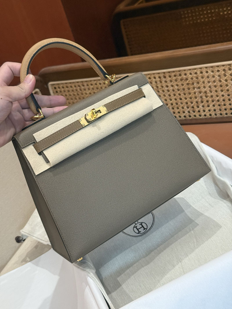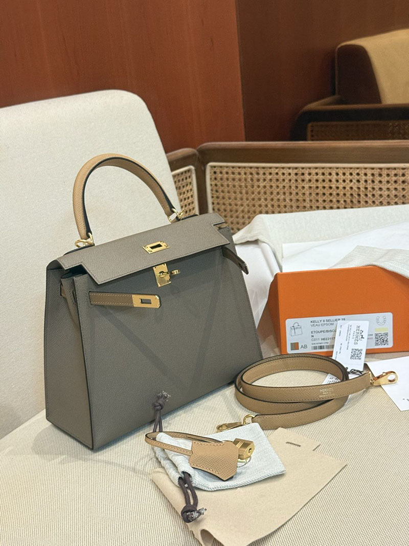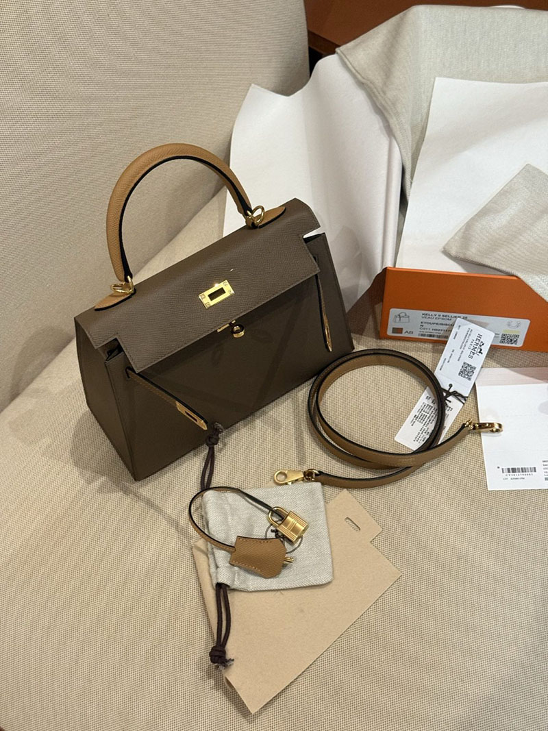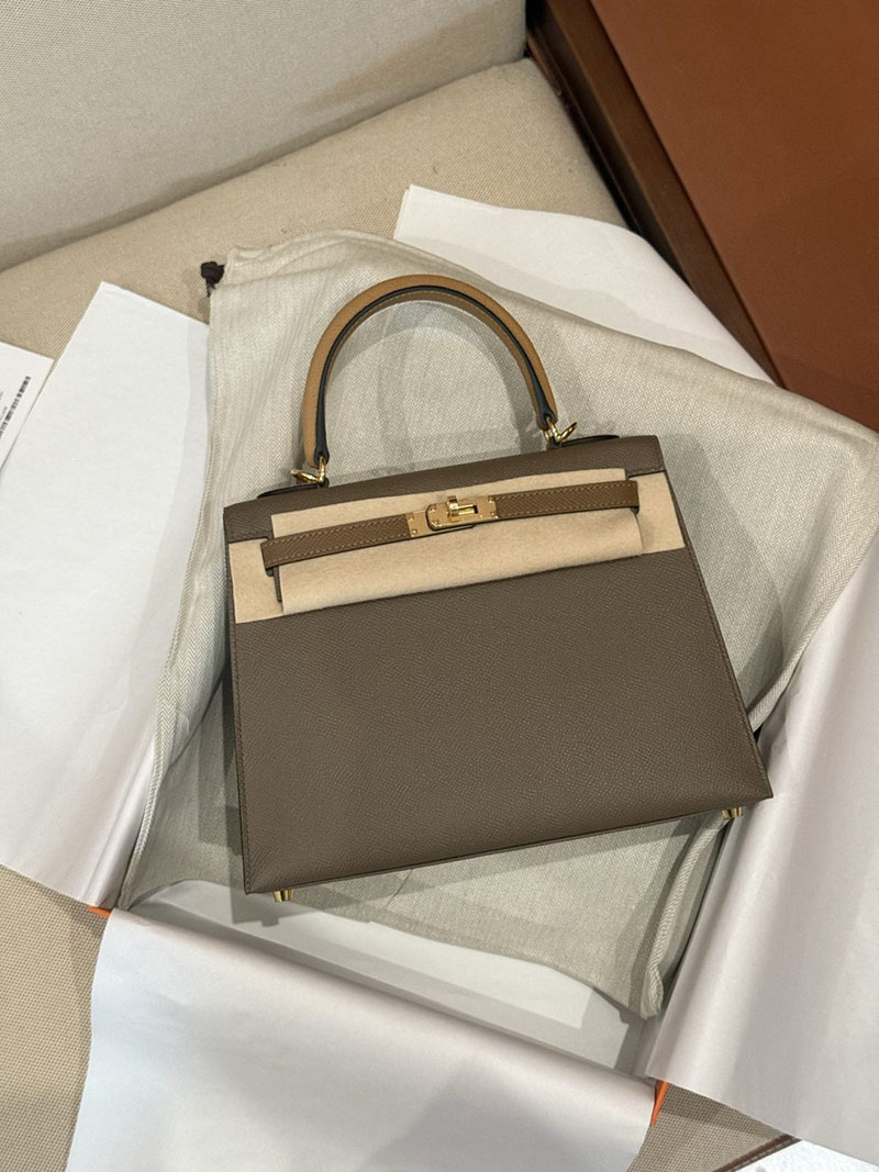 エルメスケリーバッグ定価 HERMES ケリー25 外縫い エトゥープ/ビスキュイ/アルザン ヴォーエプソン ゴールド金具 2524160