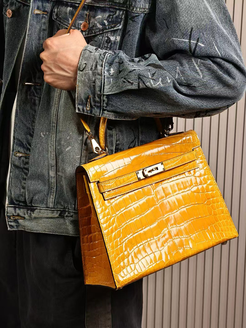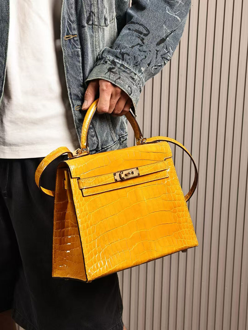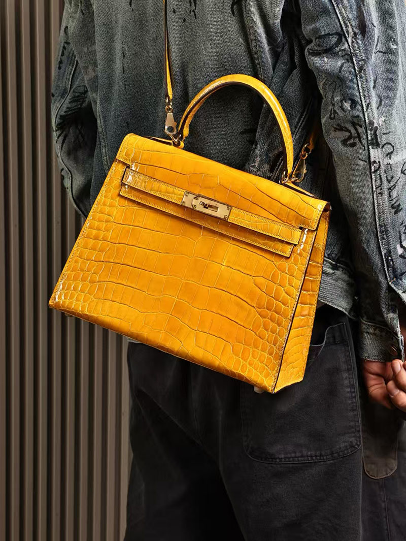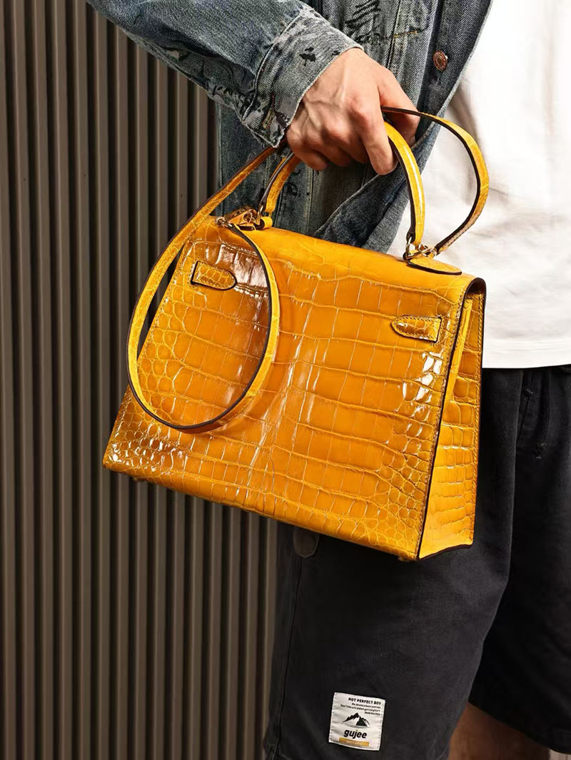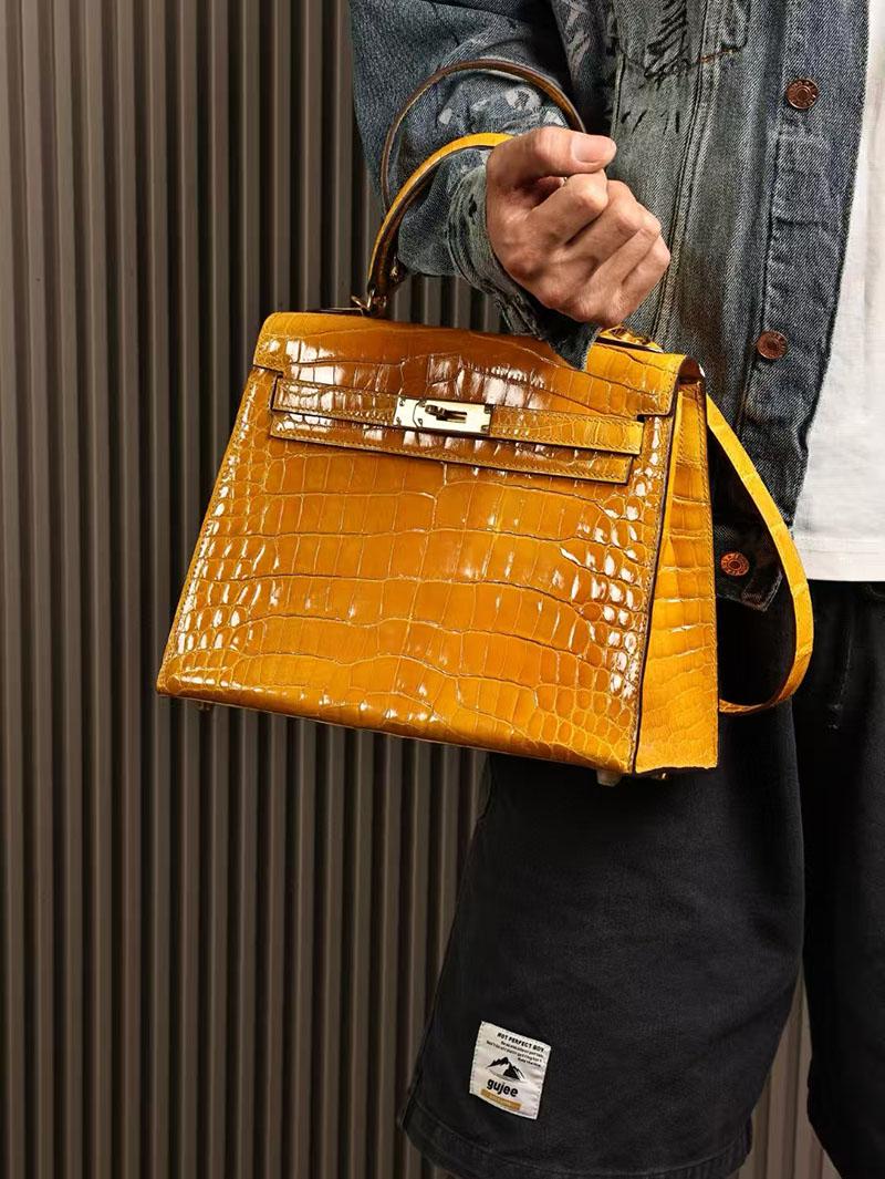 エルメスコピー HERMES ケリー28 外縫い ジョーヌアンブル クロコダイル アリゲーターマット ゴールド金具 2524011