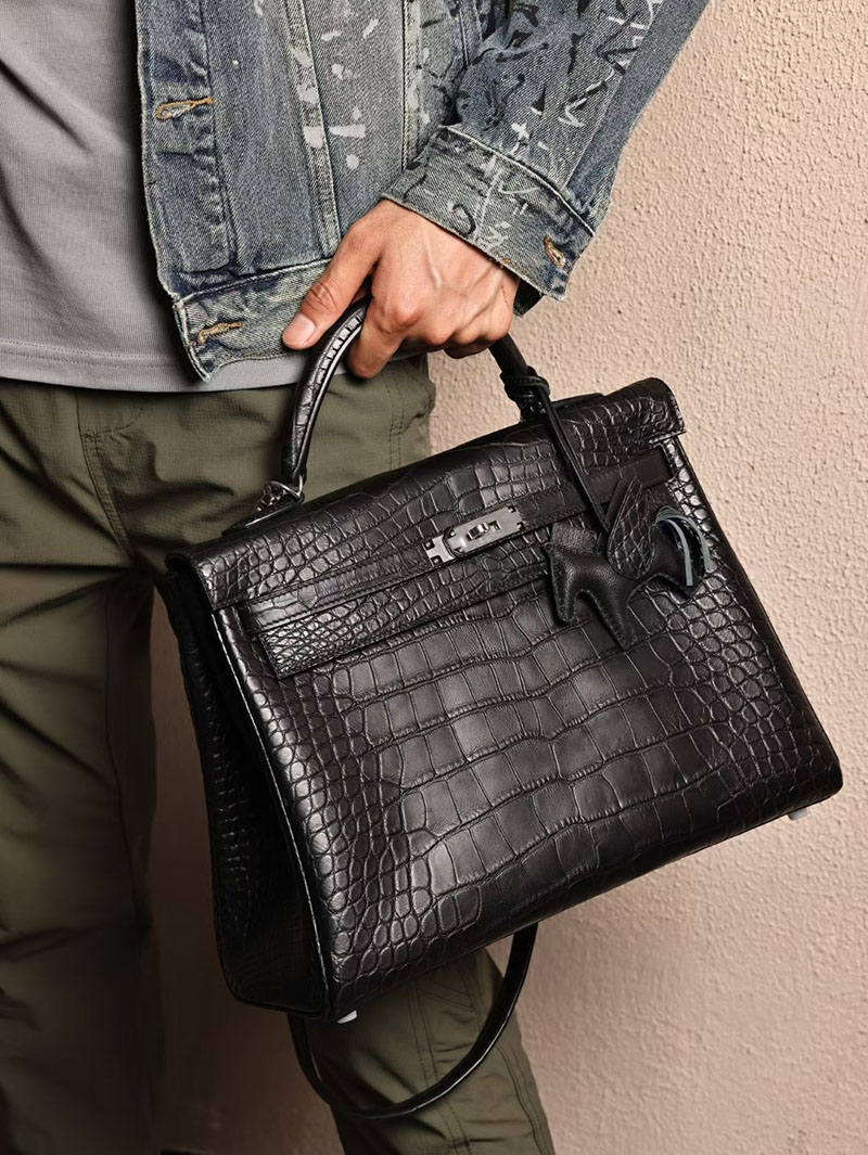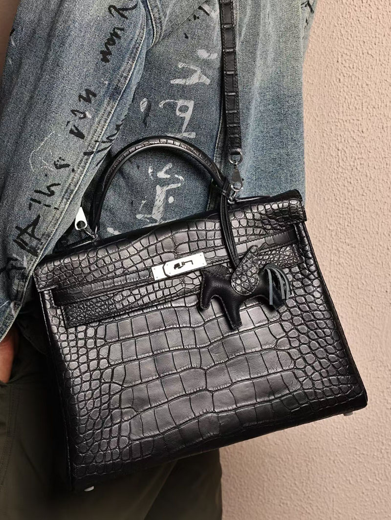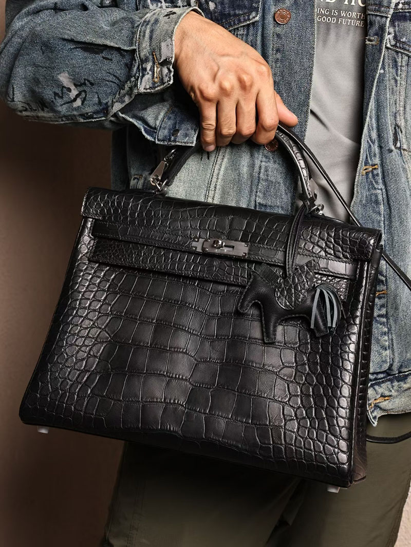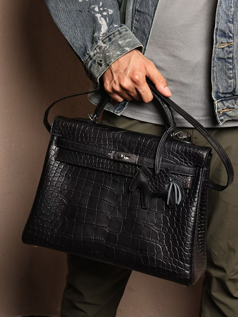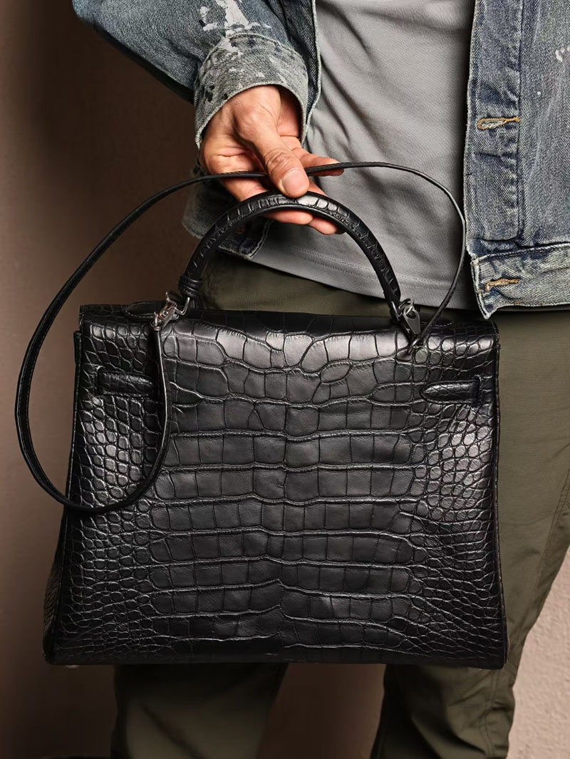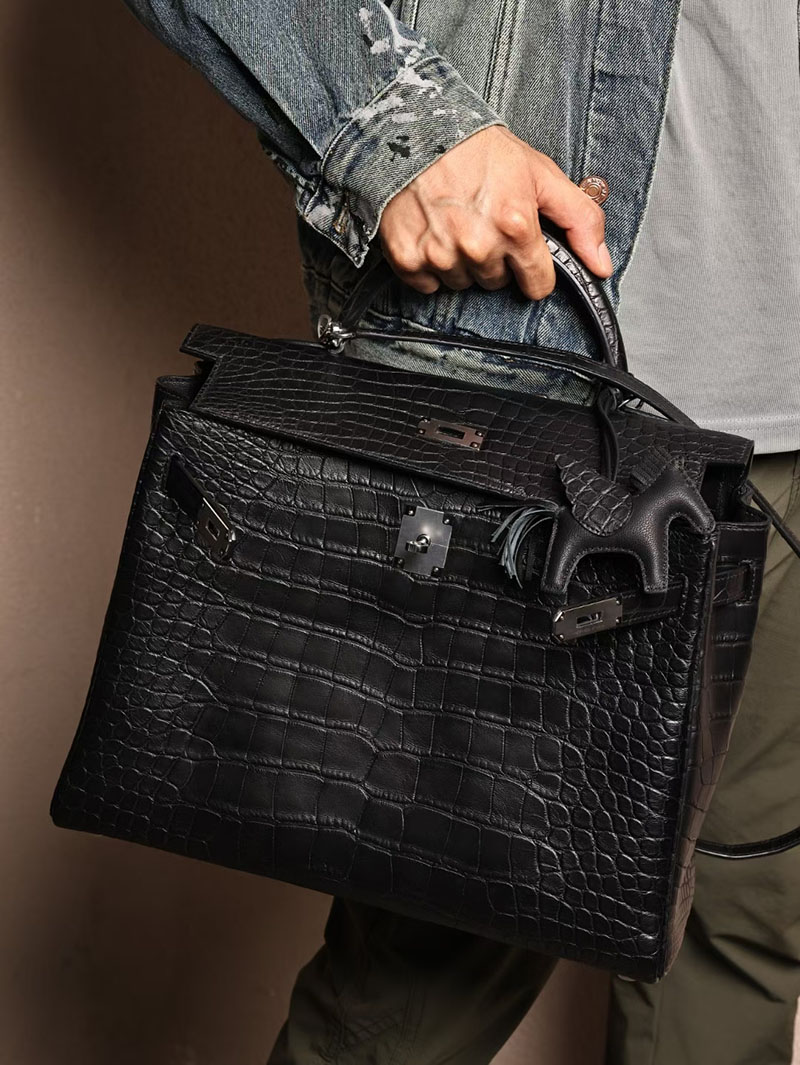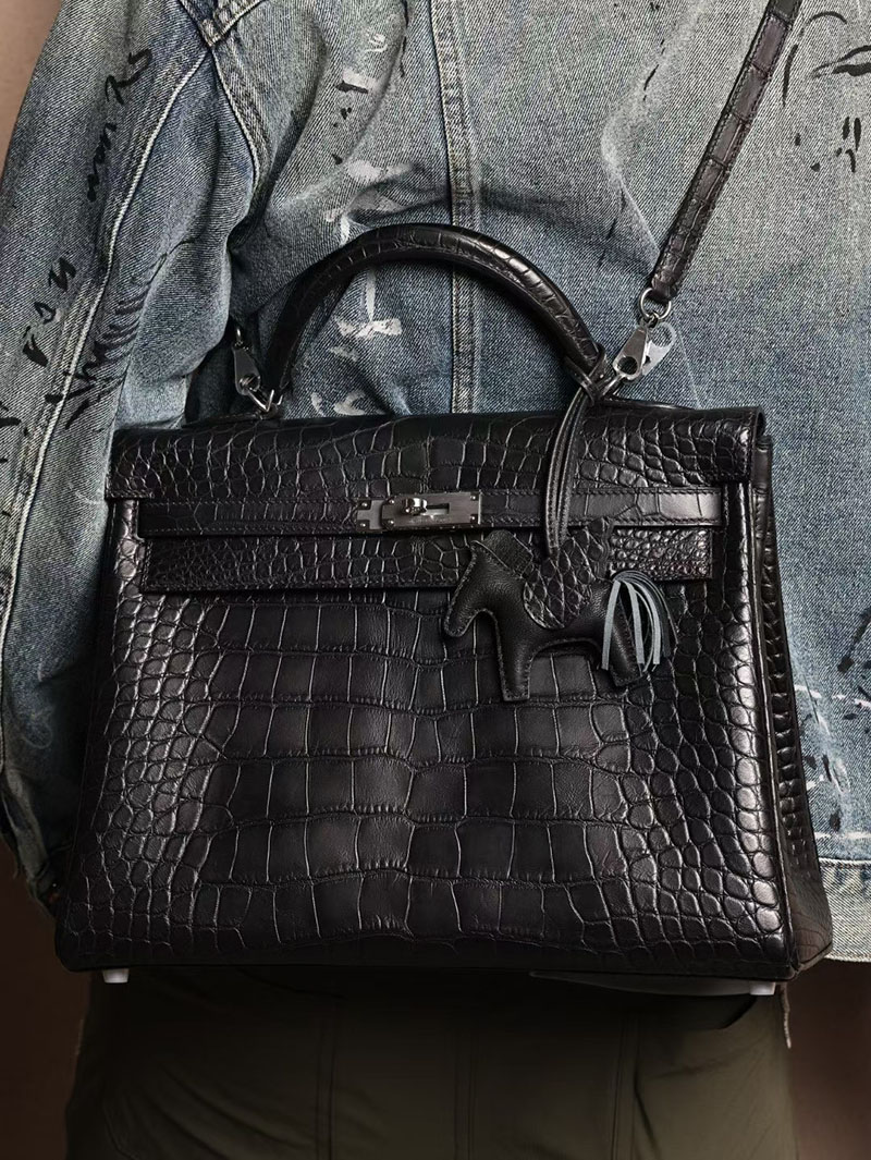 エルメスコピー ケリー35 メンズ HERMES ケリー35cm 内縫い 黒 ブラック クロコダイル アリゲーターマット シルバー金具 2524168