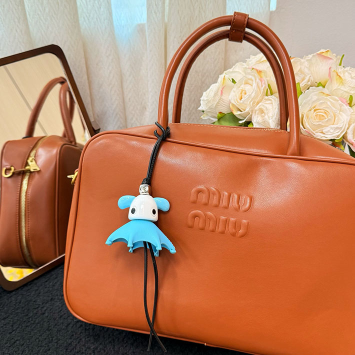 カーフスキン、フェルト、アセテートを採用したチャーム。ループ状のカーフスキンストラップとアナグラムダイス付き。パズル10周年記念コレクションのアイテムである復刻モデルのパズル10 クラウド リエディション バッグに着想を得ています。