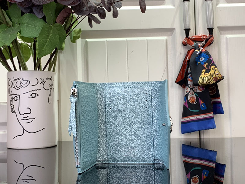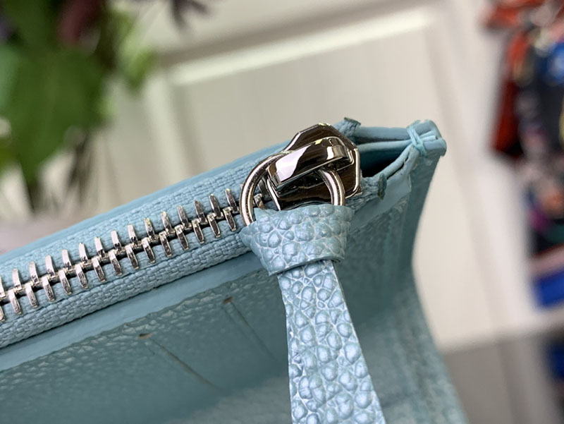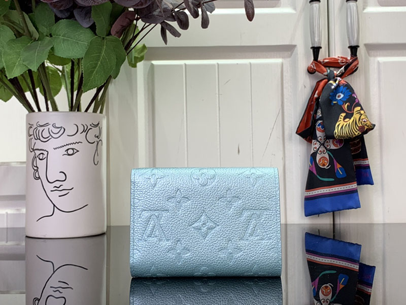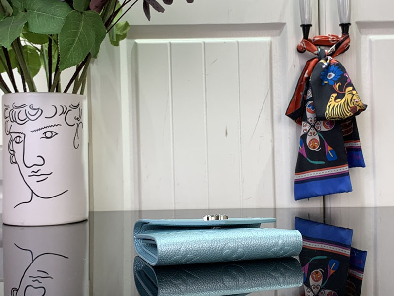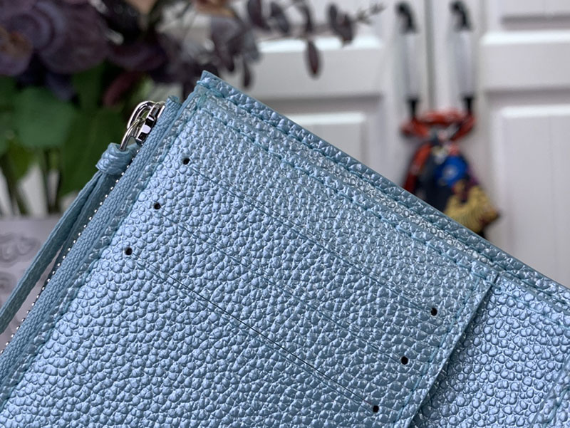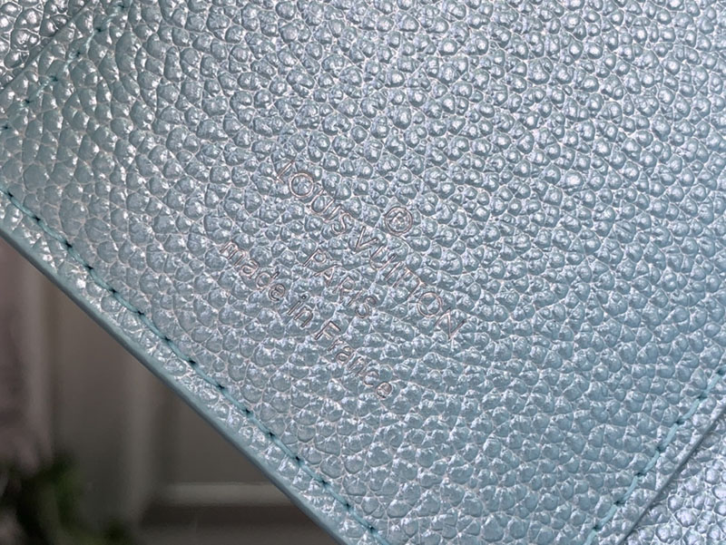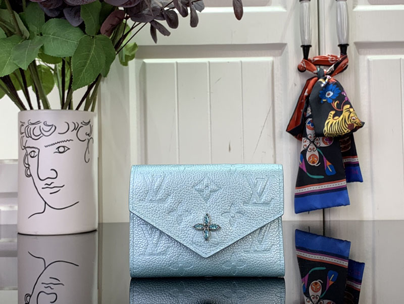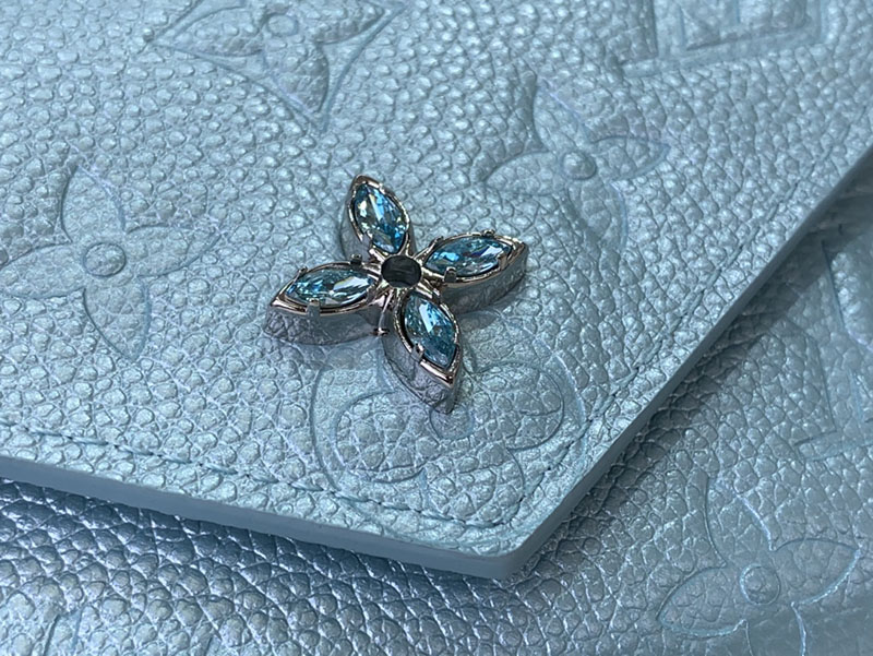 「LV SKI」コレクションの一部である「ポルトフォイユ・ヴィクトリーヌ」。エレガントなアズール・フロストの色合いと光沢感が目を引きます。メゾンを象徴するモノグラム・アンプラント レザーで仕立て、きらめくストラスで飾ったモノグラム・フラワーのスナップボタンをあしらいました。カードや紙幣、コインを整理できる充分なスペースを備えた内装も魅力。