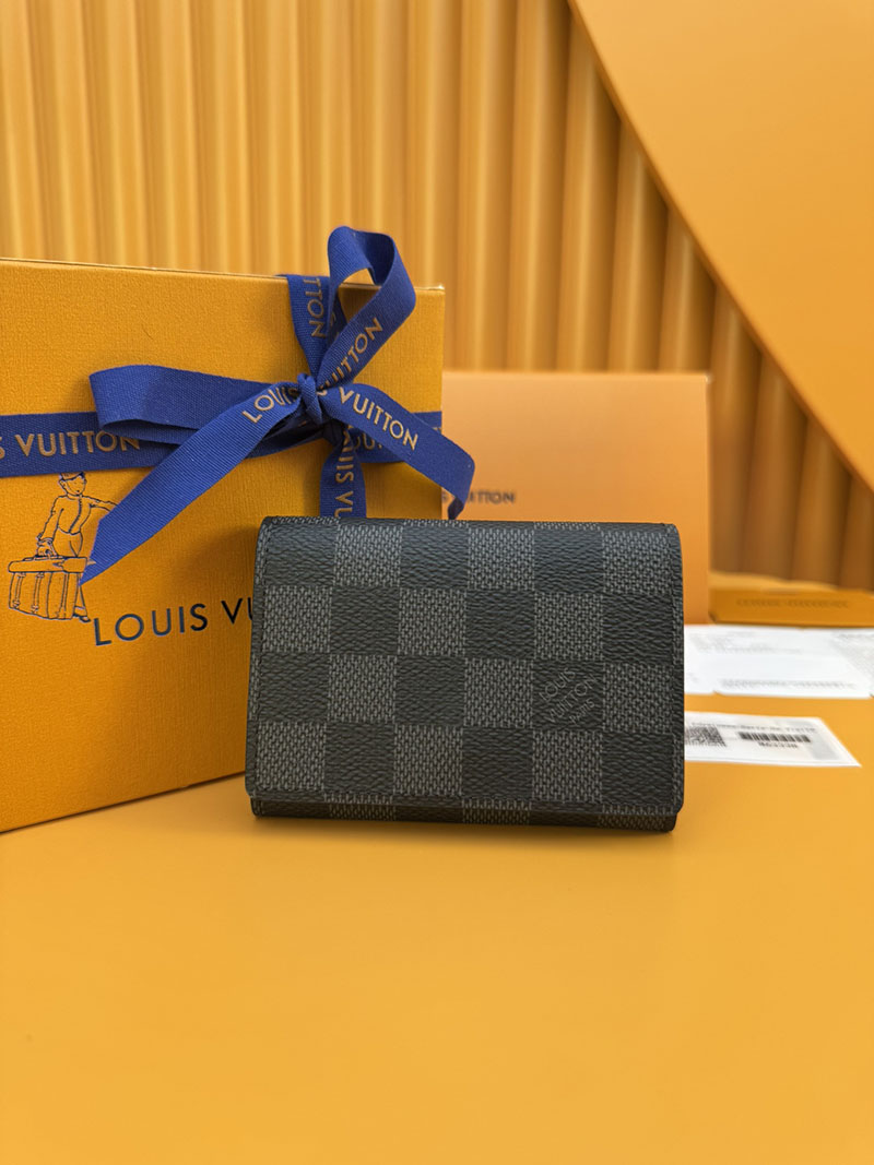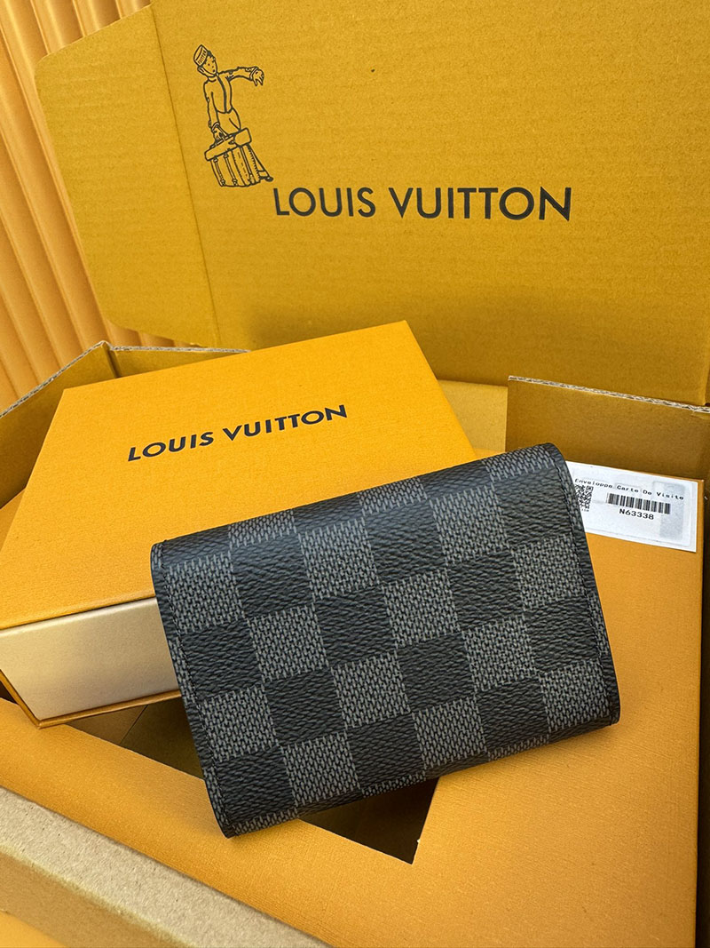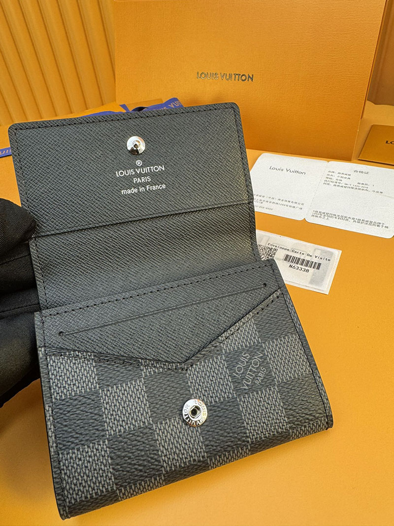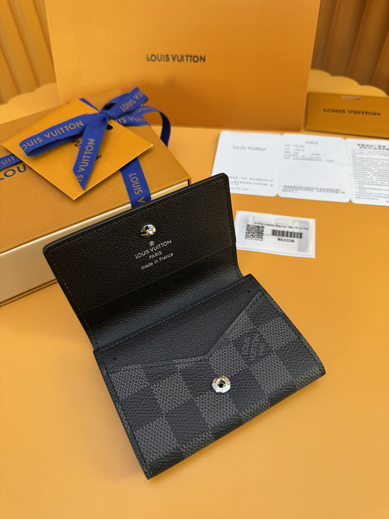 ダミエ・グラフィット キャンバスを使用したスリムで洗練された印象の「アンヴェロップ・カルト ドゥ ヴィジット」。あらゆるポケットやバッグにすっきり収まり、スナップ開閉式でクレジットカードなどを安全に持ち運ぶことができます。