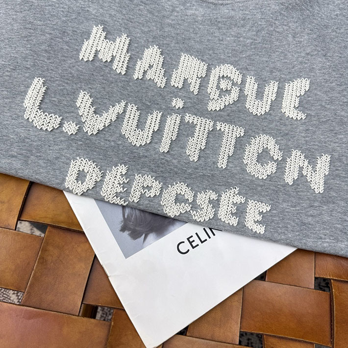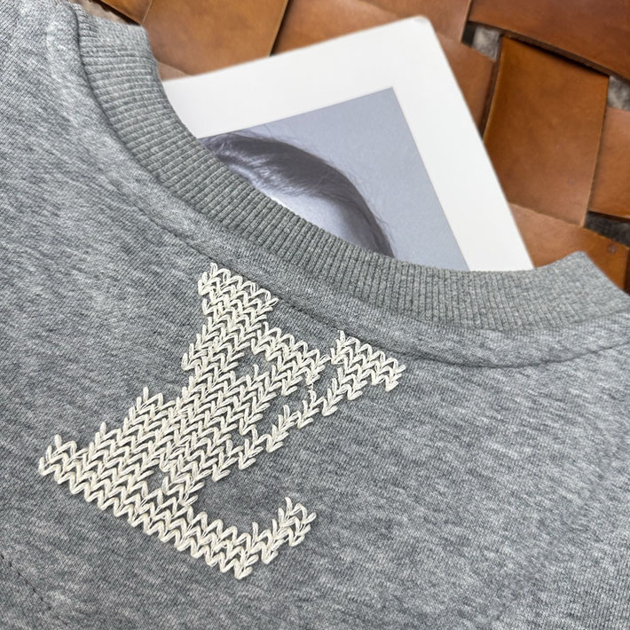 柔らかなコットンを使用したグレーのスウェットシャツ。タイムレスでカジュアルな1着をグラフィカルなシグネチャーの刺繍で引き立てました。前面にコントラストを効かせたホワイトの「Marque L. Vuitton Déposée」シグネチャーを大きめのステッチで遊び心たっぷりに刺繍し、手編みのようなトロンプ・ルイユ(騙し絵)風の効果を演出。背面にも同じ技法でLV シグネチャーを添えました。