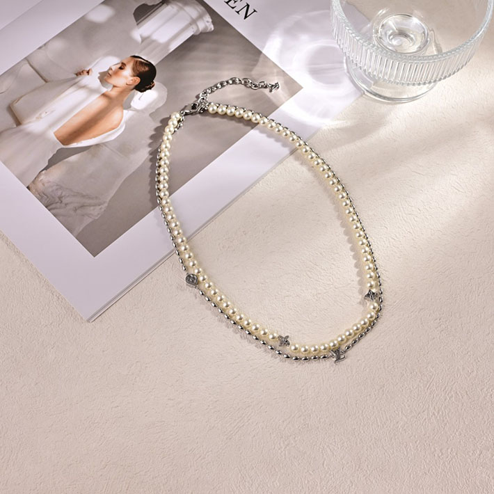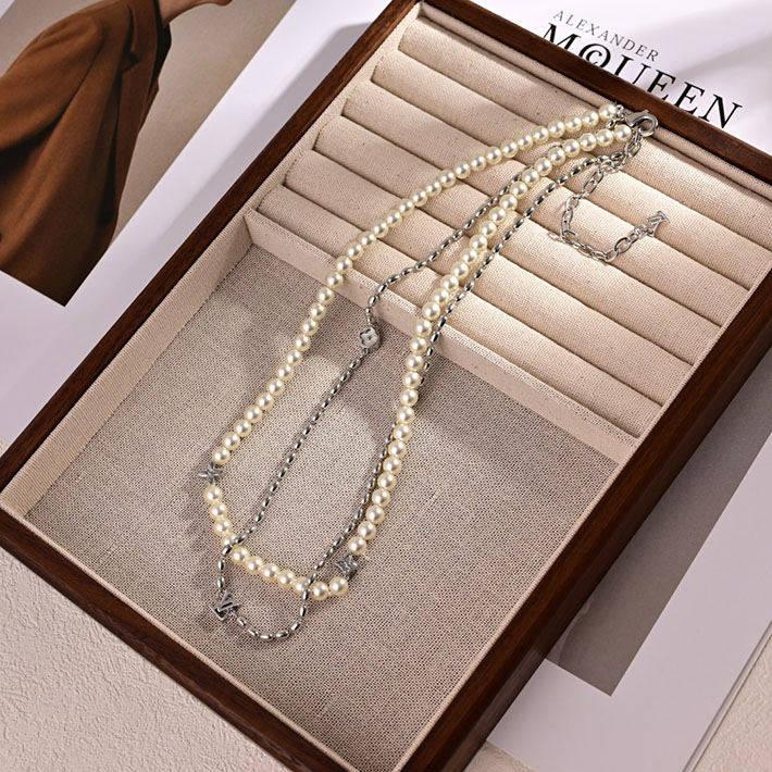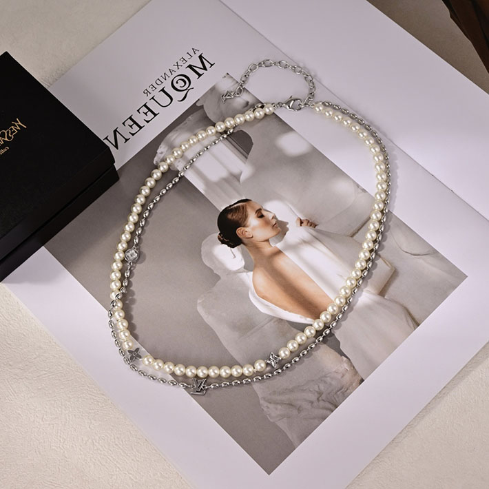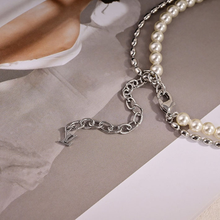 世界を飛び回る男性にぴったりの、今シーズンならではの「ネックレス・パール フュージョン」。装いにエッジィで現代的なひねりを加えるアイテムです。ガラスパールとシルバーカラーのメタルビーズを2段に重ね、モノグラム・フラワーとLV イニシャルの精緻な刻印を散りばめました。アジャスターチェーンにあしらった繊細なLV チャームの留め具が、美しいデザインを完成させます。