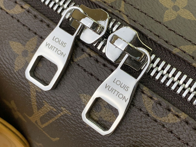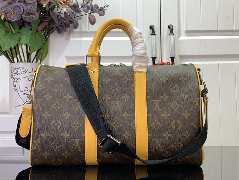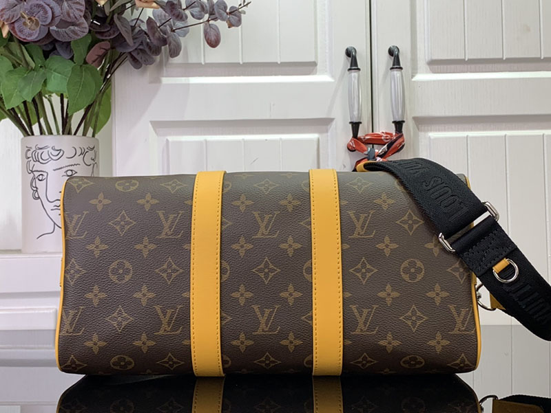 モノグラム・マカサー キャンバスで仕上げた「キーポル・バンドリエール 35」。染色したカウハイドレザーのサイドバンドとトップハンドルが特徴です。同系色のレザーを使用した取外し可能なネームタグには、「Volez, Voguez, Voyagez(空へ、海へ、彼方へ)」シグネチャーがあしらわれています。トリミングと色を揃えた内装のライニングも魅力。