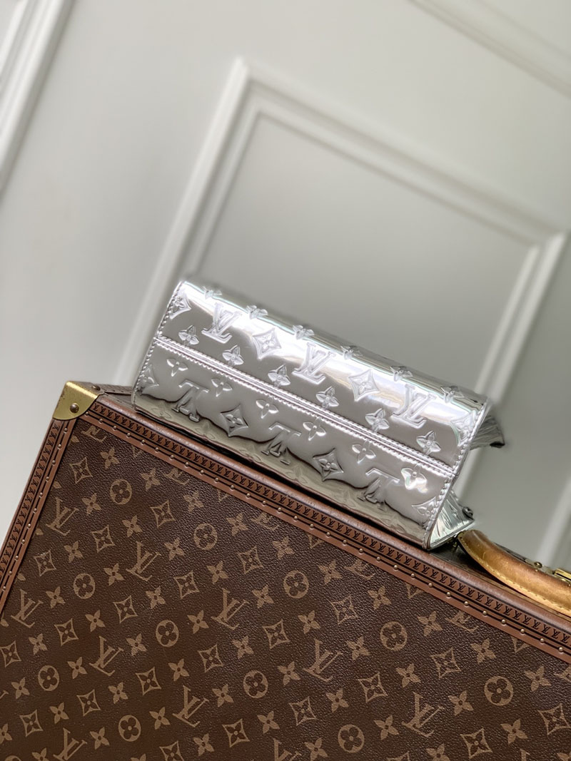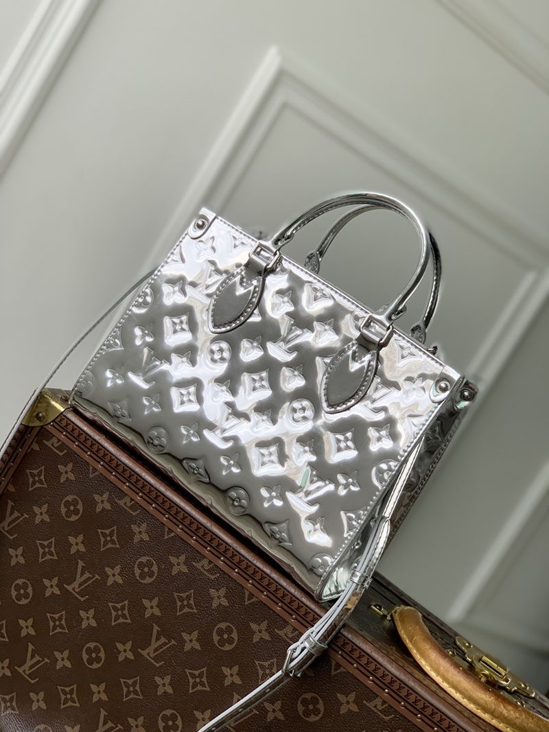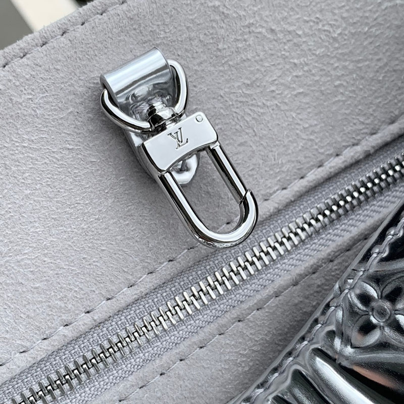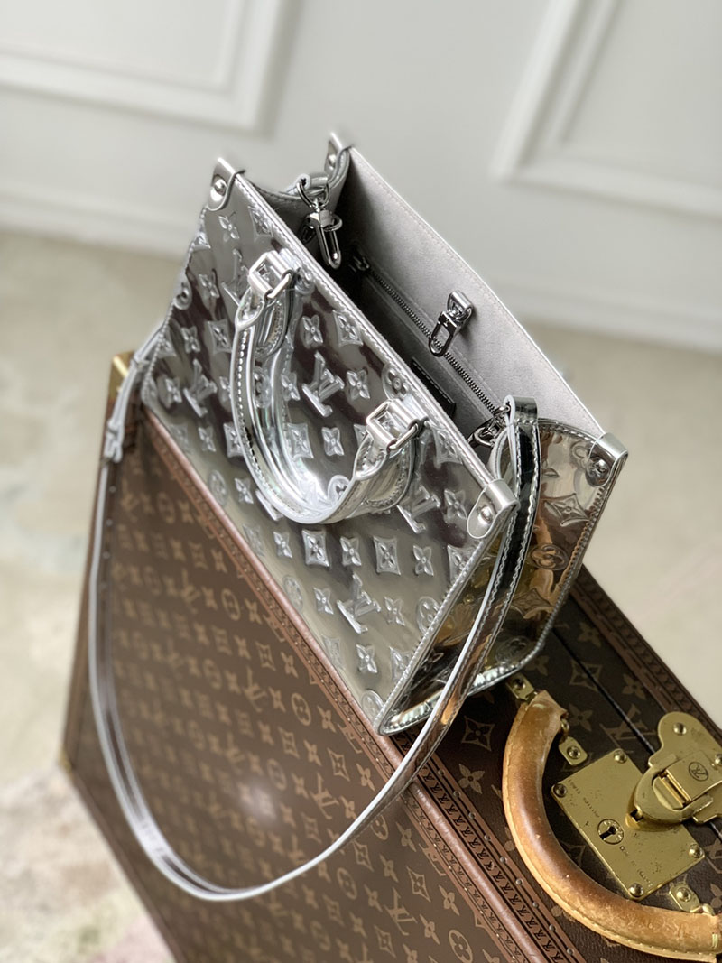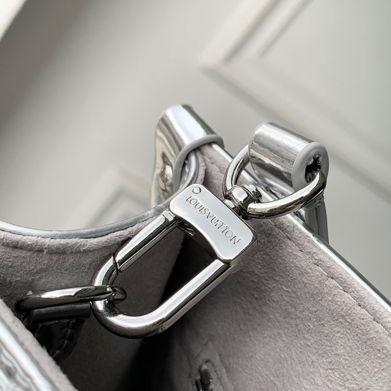 「LV SKI」 コレクションから登場した、モノグラム・ミロワールで仕上げた「オンザゴー PM」。たっぷりとしたサイズに仕上げたアイテムです。 ラミネート加工を施したキャンバスを使用することで耐久性を高めつつ、光を受けて輝くシルバーカラーと調和するメタルパーツをあしらいました。内装には複数のポケットを備え、毎日の必需品はもちろん、小さな本まで収納できる多用途なデザイン。