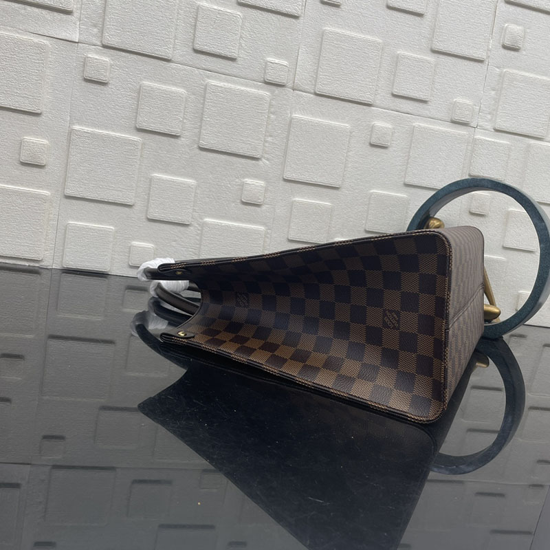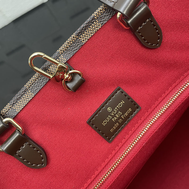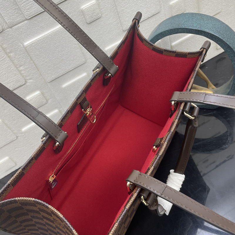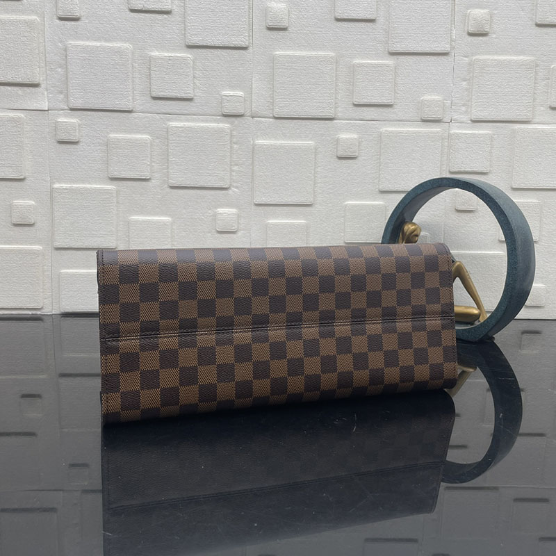 The classic OnTheGo MM handbag is reimagined for the season in Damier Ebene canvas, trimmed with smooth cowhide leather. Accented with gold-toned hardware, it can be hand-carried by the top handles, or styled as a shoulder bag thanks to the longer handles. The sophisticated design is fitted with one interior pocket, and is generously sized to store a laptop as well as other daily essentials.