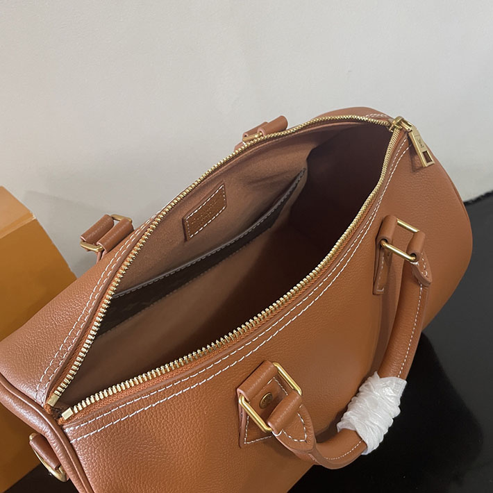 「ロウキー」ラインから登場した、旅のお供に最適な「スピーディ・ソフト 30」。タイムレスな色合いのしなやかなレザーで仕上げました。ヴィンテージ風ゴールドカラーのシグネチャーのLV パドロック(錠前)をあしらった上品なデザインで、取外し可能なストラップにより多彩な持ち方を楽しめます。毎日の必需品を収納できるサイズで、内装にはフラットポケット付き。