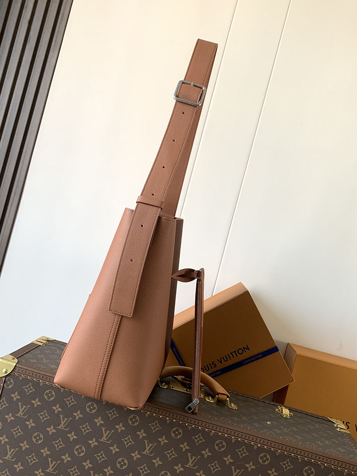 スタイルと機能美が融合した、LV タッチ・レザーの「ヴェルソ・トート」。片面は滑らかなグレインレザー、もう片面は同系色のスエードで仕上げたリバーシブルタイプで、2通りのユニークな装いを楽しめます。「V」シグネチャーのステッチを施したポケットを両面に配し、取外し可能なスエード製ポーチがさらに実用性を高めます。