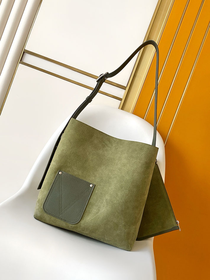 スタイルと機能美が融合した、LV タッチ・レザーの「ヴェルソ・トート」。片面は滑らかなグレインレザー、もう片面は同系色のスエードで仕上げたリバーシブルタイプで、2通りのユニークな装いを楽しめます。「V」シグネチャーのステッチを施したポケットを両面に配し、取外し可能なスエード製ポーチがさらに実用性を高めます。