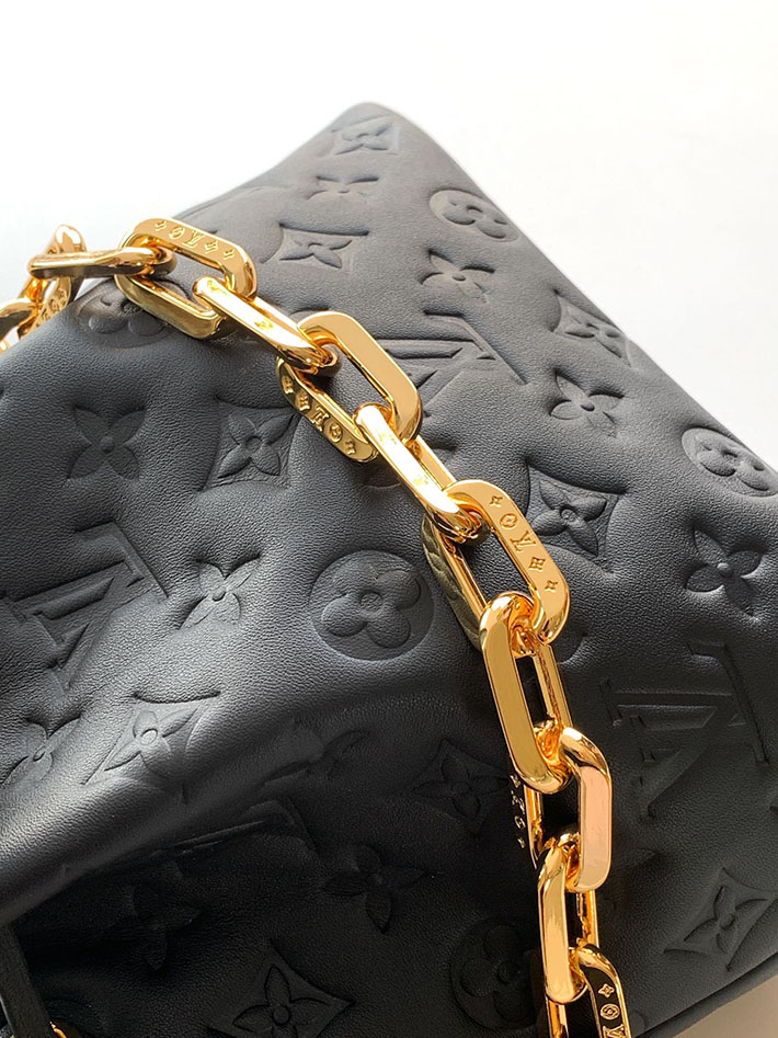 新たに「クッサン」ファミリーに加わった「クッサン バケット」。洗練されたラムレザーにモノグラム・パターンをエンボス加工で施しました。デイタイムからイブニングシーンまで活躍するフェミニンな一品を、メゾンを象徴するLV パドロック(錠前)や取外し可能な「クッサン」チェーンなど、ゴールドカラーの金具が引き立てます。機能性とエレガンスを兼ね備えたドローストリングの開閉により、さまざまな装いが楽しめます。