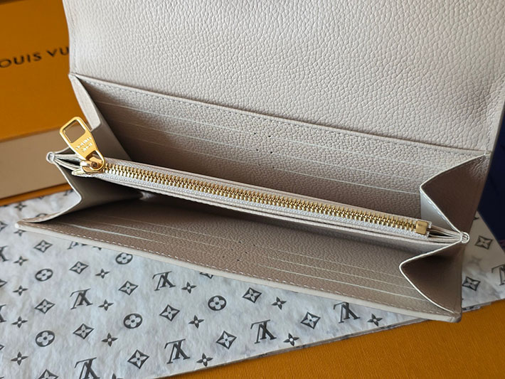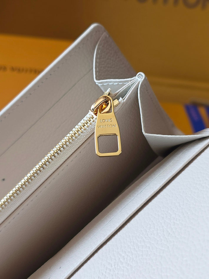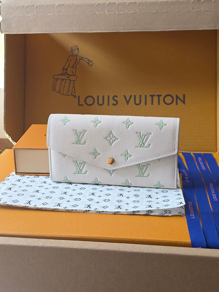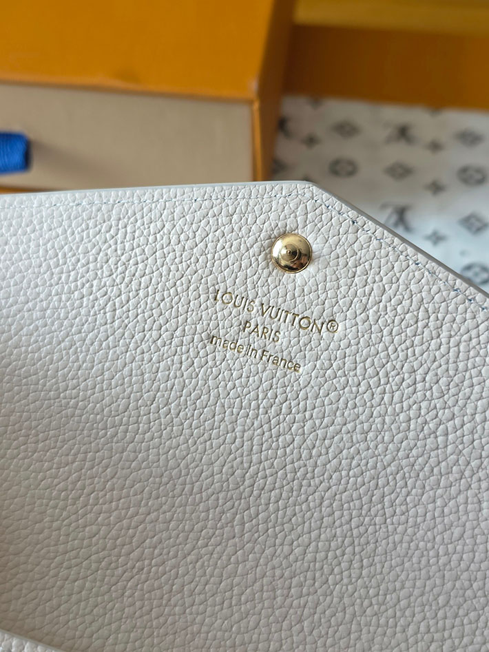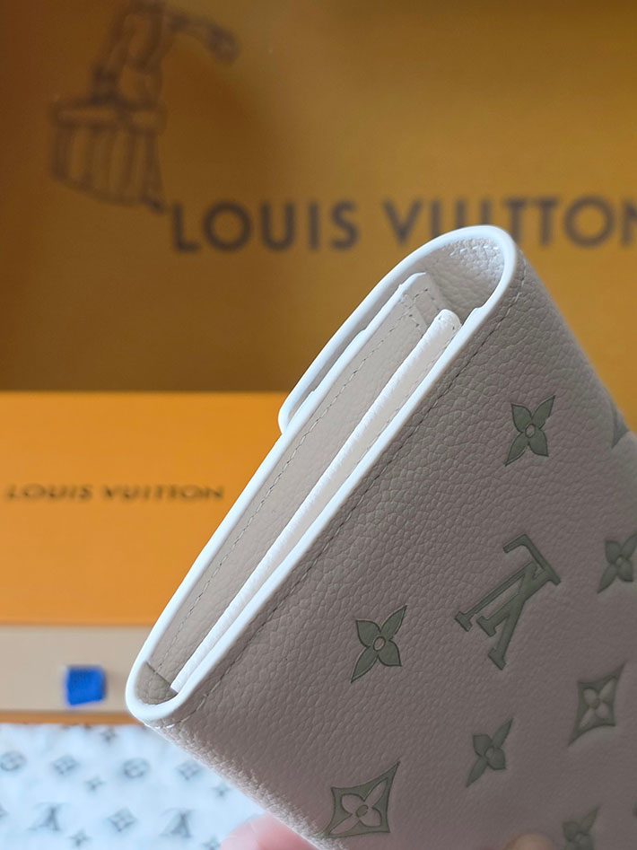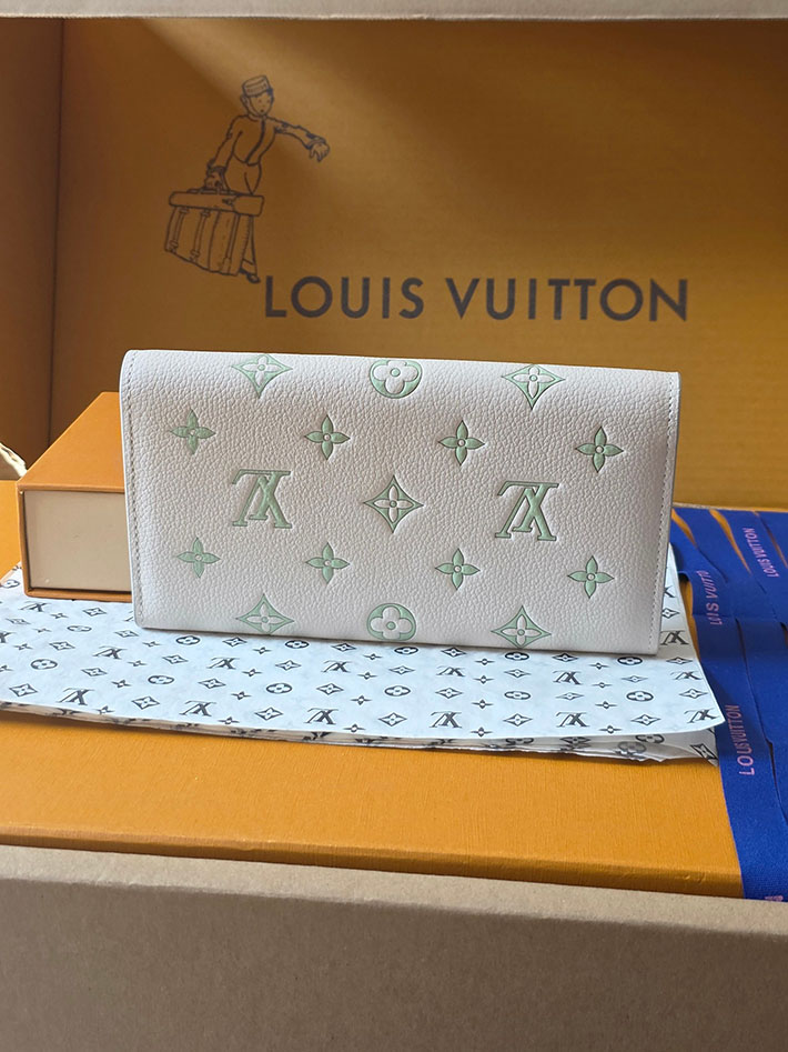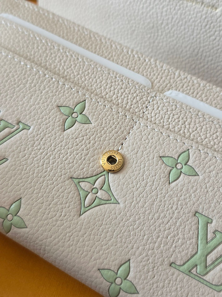 「スウィート エスケープ」コレクションから登場した「ポルトフォイユ・サラ」。ミルキーホワイトとグリーンのバイカラーが際立つエレガントなアイテムです。メゾンを象徴するモノグラム・アンプラント レザーを使用し、ゴールドカラーのスナップボタンで洗練された印象に仕上げました。内装には紙幣やコイン、16のカードを収納できる複数のコンパートメントを備えています。