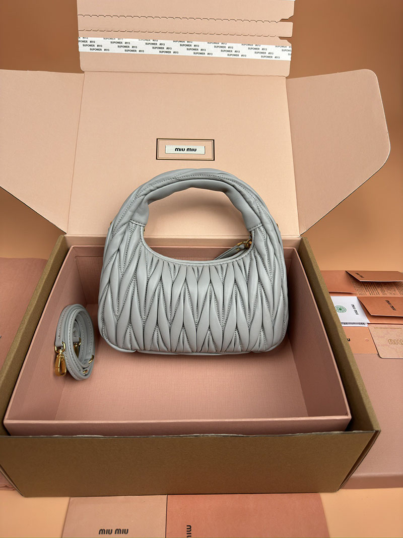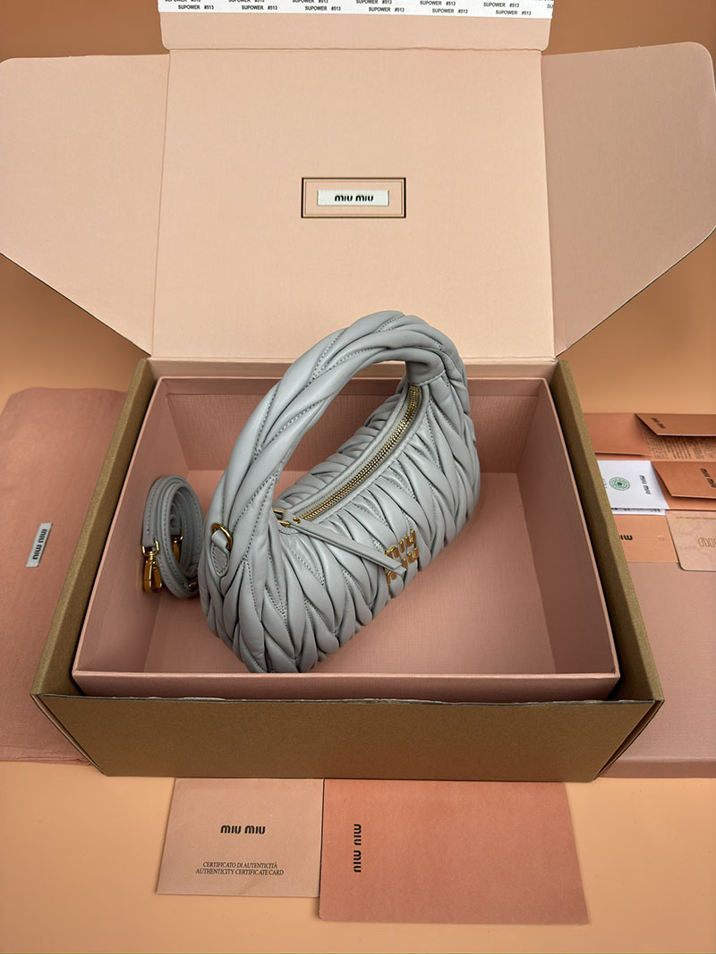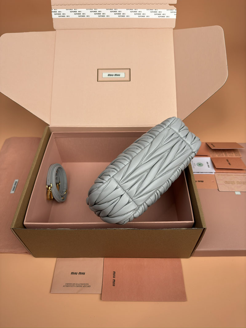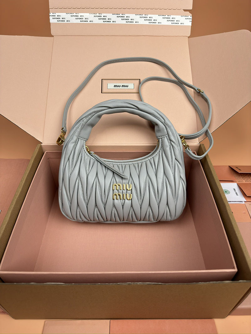 MiuMiu ワンダー マテラッセレザー ホーボーバッグ パールグレー 5BC125_AN88_F0164_V_OOY ゴールド金具 ミュウミュウ バッグ 芸能人