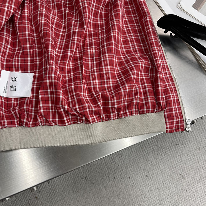 パナマコットンの質感で個性をプラスした、オーバーサイズのブルゾンジャケット。コントラストカラーの個性的なチェック柄のライニングと、典型的なメンズウェアのディテールを施しました。ミュウミュウが試みる新しいエレガンスを体現しています。