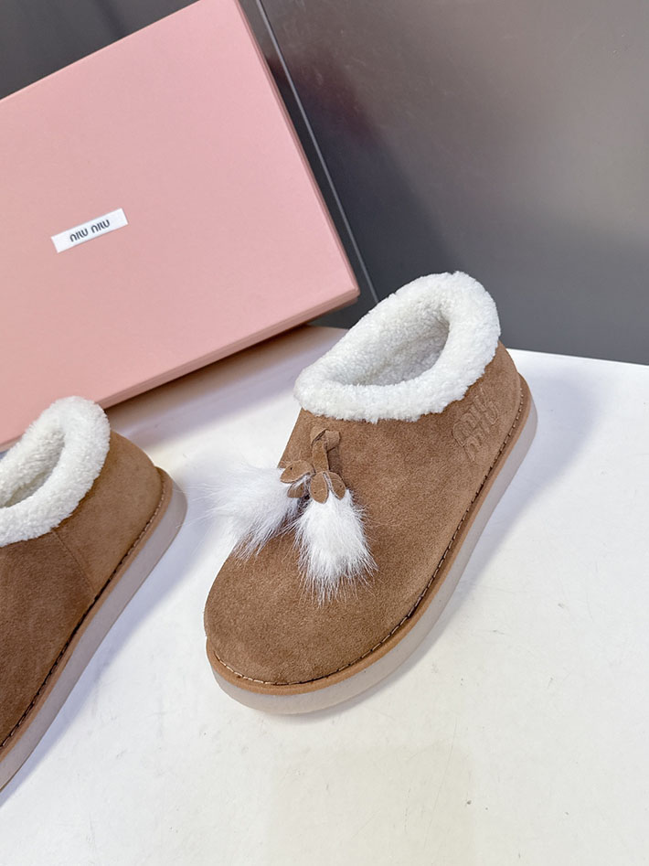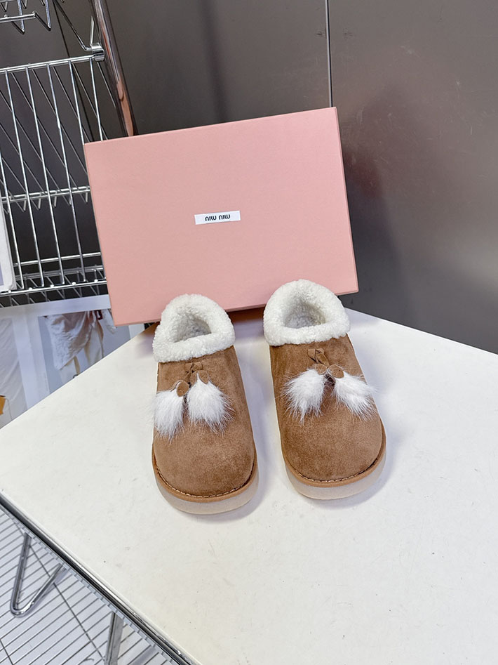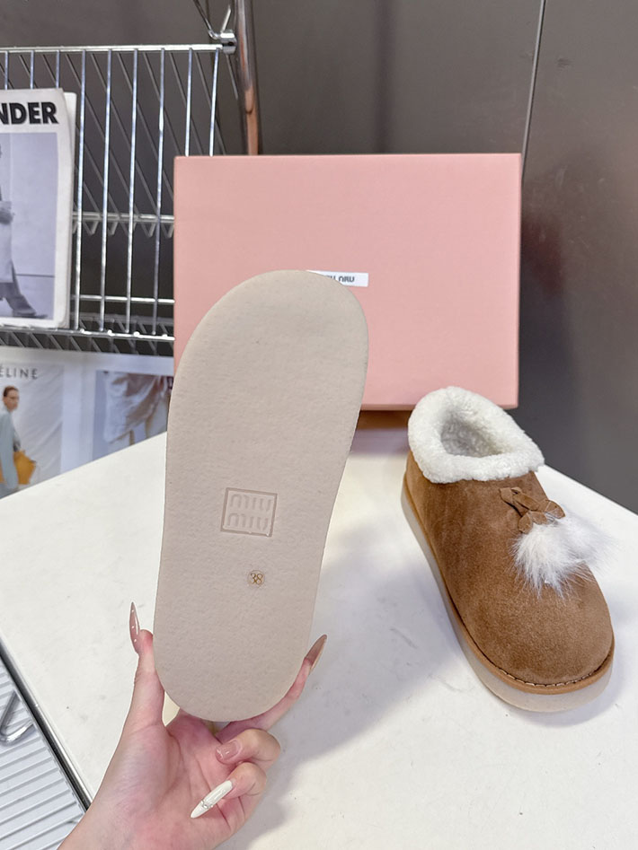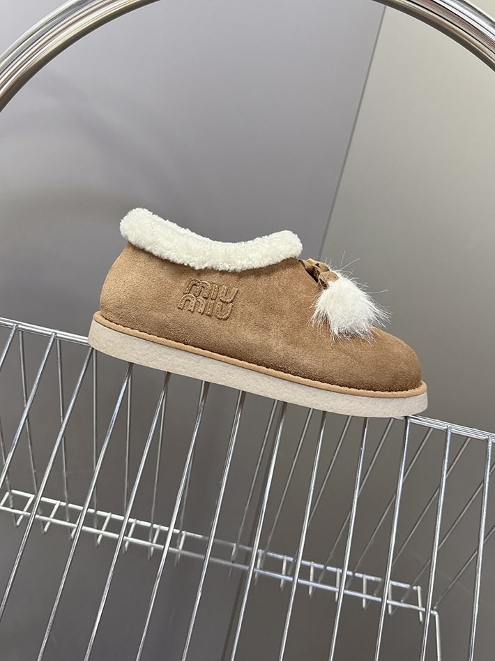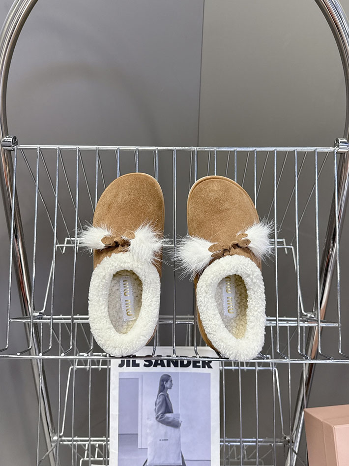 柔らかな軽さが特徴のスエードとシアリングのミュール。洗練されたテクスチャーとフロントの遊び心あるディテールが、ミュウミュウの若々しく現代的なスピリットを反映しています。