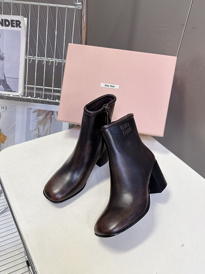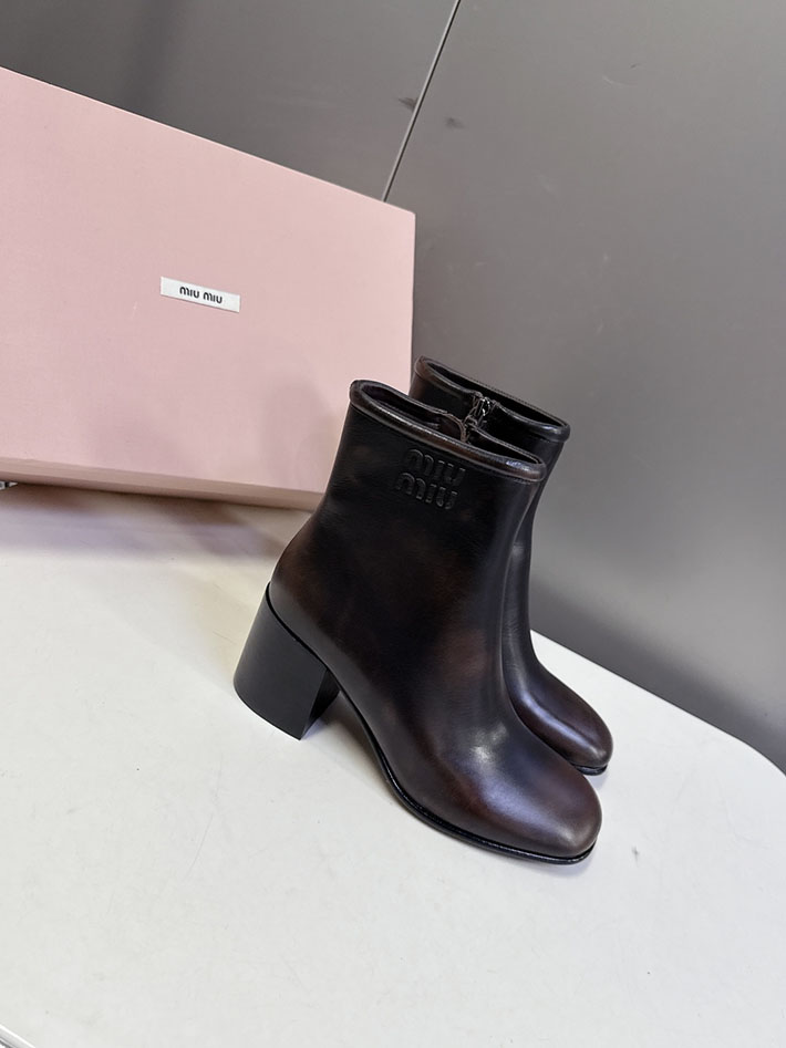 刺繍ロゴがクラシックなラインのブーツにアイコニックな魅力を加え、独特のスモーキーなレザー仕上げは、ミュウミュウのヴィンテージへのこだわりと洗練されたクラフツマンシップを反映している。