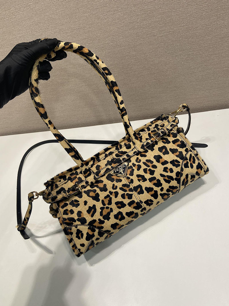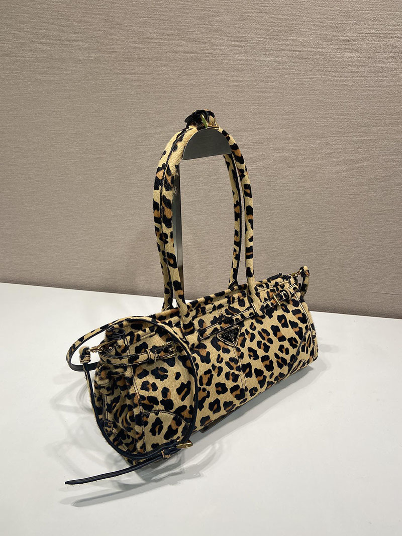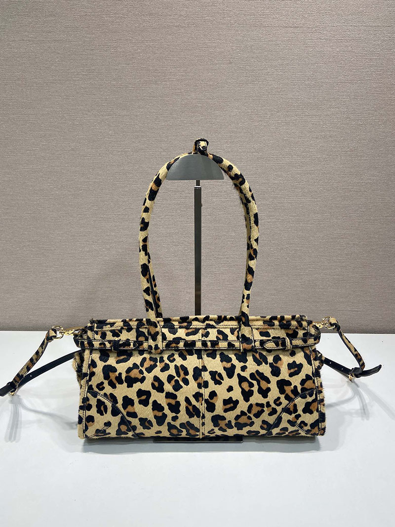 現代的なスタイルと伝統が融合したレザーのハンドバッグ。エレガントなゴールドトーンのメタルパーツとアイコニックなトライアングルロゴが、洗練されたデザインを引き立てています。レオパードプリントをあしらい、大胆なアクセントをプラスしました。