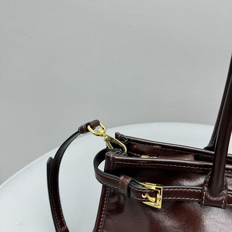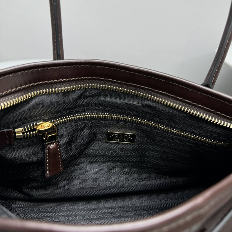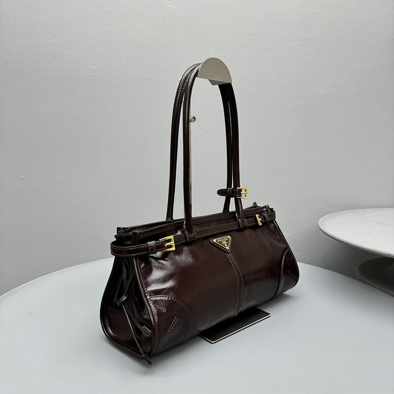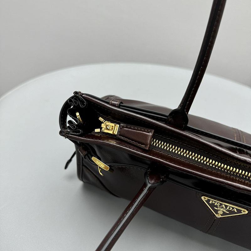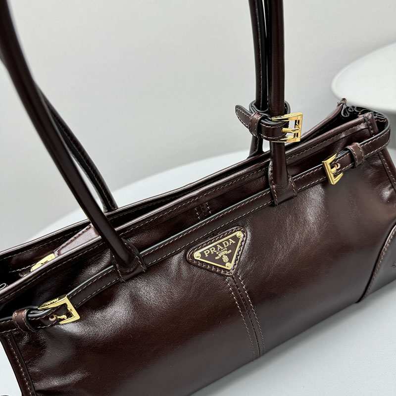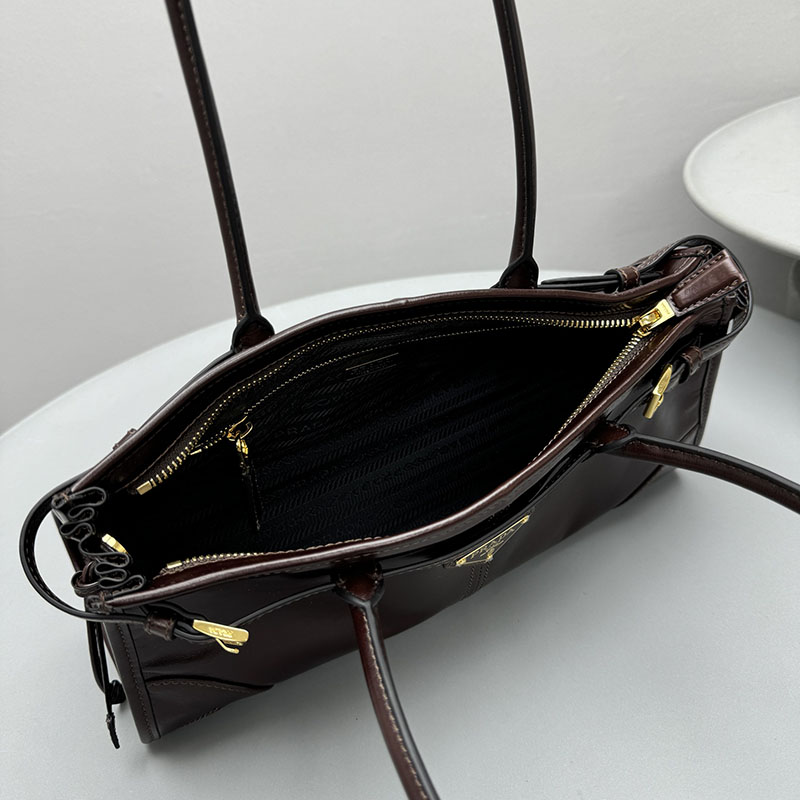 多用途でモダンな魅力を持つ艷やかな仕上がりのソフトレザーを使用した、実用的でエレガントなハンドバッグ。幾何学的なデザインに、多彩な要素が個性的でありながら洗練された美しさで1つのスタイルに融合されています。レクタンギュラーのシルエットに上品なストラップのディテールをあしらい、内側にファスナー付ポケットを配しています。エナメルメタルのトライアングルロゴがプラダらしいアイコニックな魅力を添えています。
