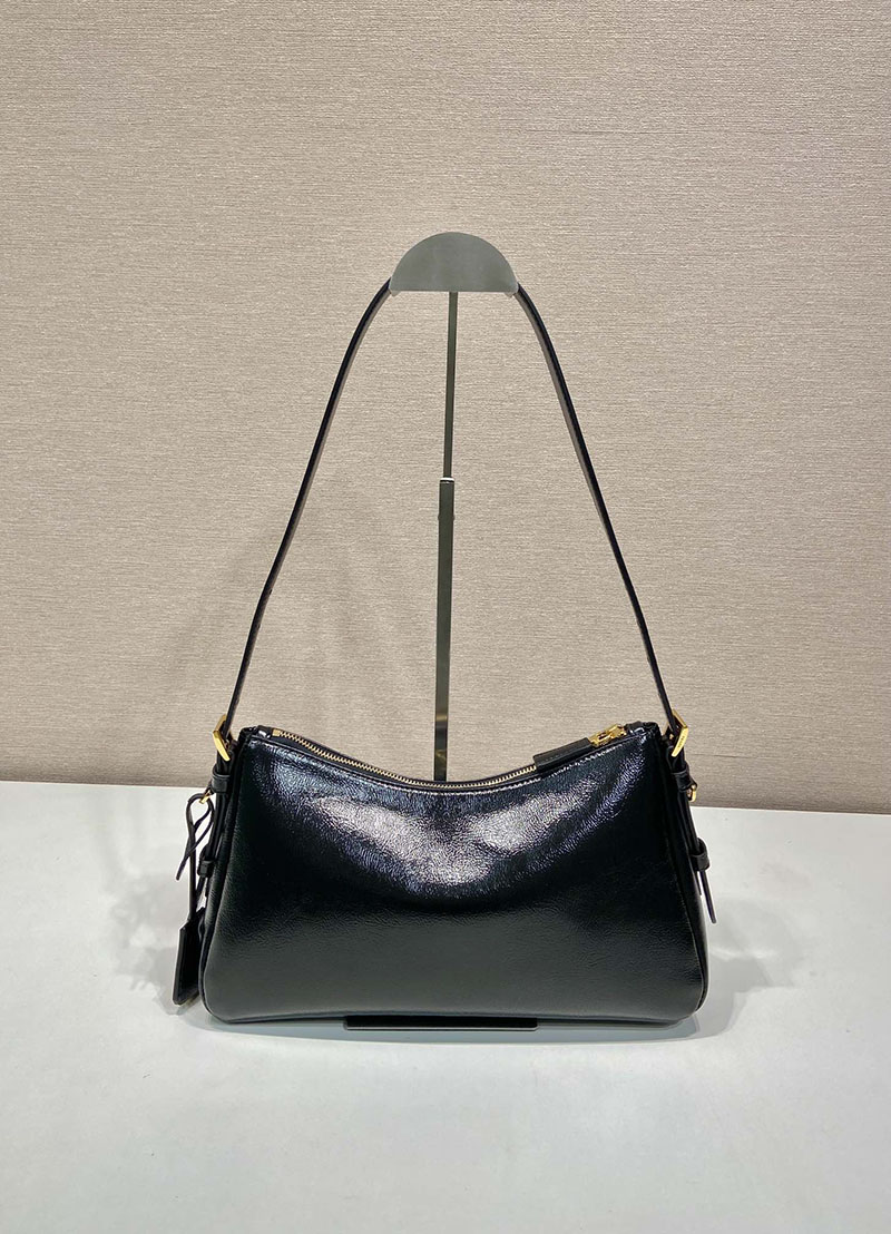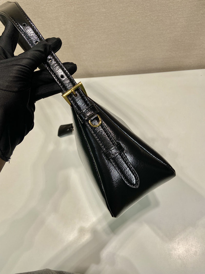 ナプラックパテントレザーで柔らかなラインを強調した、プラダ エメ バッグ。独特な光沢と質感で、ヴィンテージ感のある風合いに仕上げています。1990年代の洗練されたミニマルなスタイルをデザインモチーフに、エレガントなゴールドトーンのパーツをあしらいました。