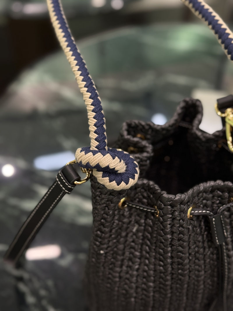 上品なパターンがあしらわれた、クロシェ編みのミニバケットバッグ。夏を思わせるアクセサリーを、レザーのディテールで仕上げました。